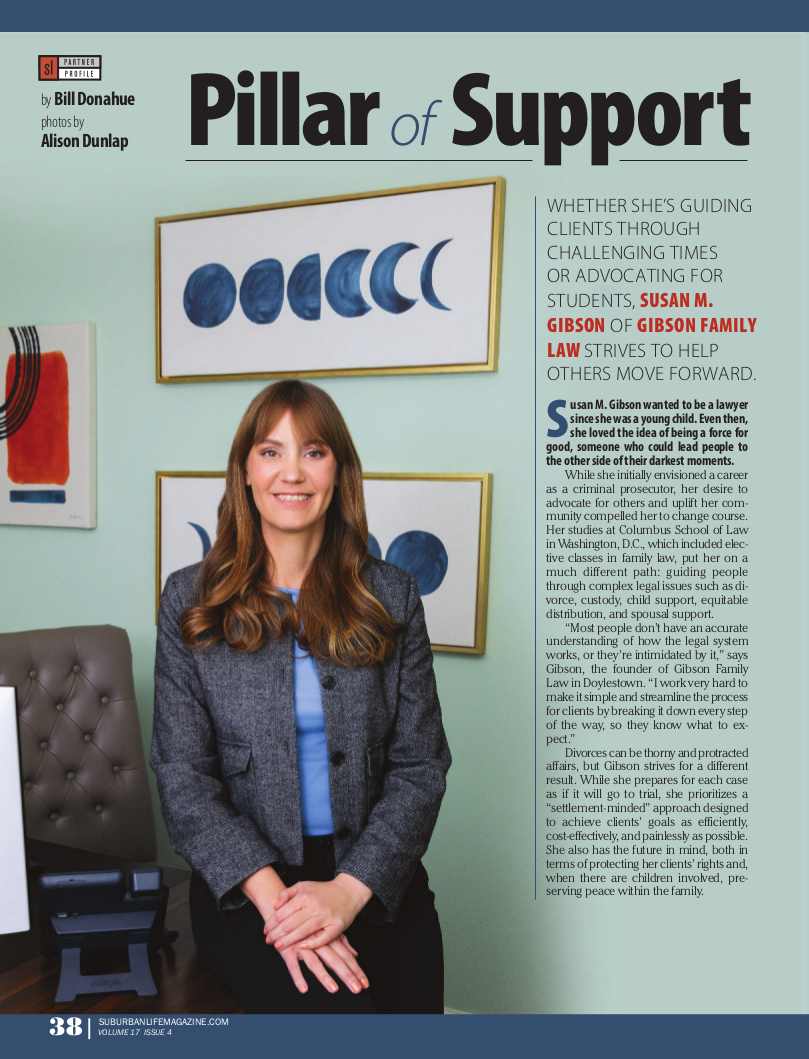 “Most people don’t have an accurate understanding of how the legal system works, or they’re intimidated by it,” says Gibson, the founder of Gibson Family Law in Doylestown. “I work very hard to make it simple and streamline the process for clients by breaking it down every step of the way, so they know what to expect.”