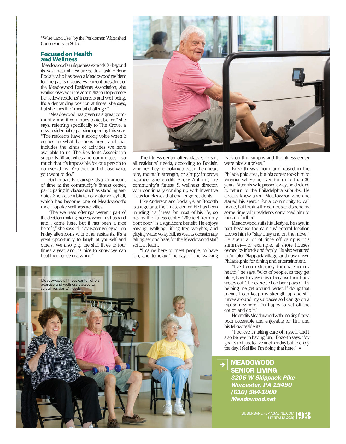 SL_MEADOWWOOD_Profile_0919 . qxp_Profile 9 / 13 / 19 10 : 04 AM Page 2 “ Wise Land Use ” by the Perkiomen Watershed Conservancy in 2016 . Focused on Health and Wellness Meadowood’s uniqueness extends far beyond its vast natural resources . Just ask Helene Boclair , who has been a Meadowood resident for the past six years . As current president of the Meadowood Residents Association , she works closely with the administration to promote her fellow residents ’ interests and well - being . It’s a demanding position at times , she says , but she likes the “ mental challenge . ” “ Meadowood has given us a great com - munity , and it continues to get better , ” she says , referring specifically to The Grove , a new residential expansion opening this year . “ The residents have a strong voice when it comes to what happens here , and that includes the kinds of activities we have available to us . The Residents Association trails on the campus and the fitness center The fitness center offers classes to suit supports 60 activities and committees — so were nice surprises . ” all residents ’ needs , according to Boclair , much that it’s impossible for one person to Bozorth was born and raised in the whether they’re looking to raise their heart do everything . You pick and choose what Philadelphia area , but his career took him to rate , maintain strength , or simply improve you want to do . ” Virginia , where he lived for more than 30 balance . She credits Becky Anhorn , the For her part , Boclair spends a fair amount years . After his wife passed away , he decided community’s fitness & wellness director , of time at the community’s fitness center , to return to the Philadelphia suburbs . He with continually coming up with inventive participating in classes such as standing aer - already knew about Meadowood when he ideas for classes that challenge residents . obics . She’s also a big fan of water volleyball , started his search for a community to call Like Anderson and Boclair , Allan Bozorth which has become one of Meadowood’s home , but touring the campus and spending is a regular at the fitness center . He has been most popular wellness activities . some time with residents convinced him to minding his fitness for most of his life , so “ The wellness offerings weren’t part of look no further . having the fitness center “ 200 feet from my thedecision - making process when my husband Meadowood suits his lifestyle , he says , in front door ” is a significant benefit . He enjoys and I came here , but it has been a nice part because the campus ’ central location rowing , walking , lifting free weights , and benefit , ” she says . “ I play water volleyball on allows him to “ stay busy and on the move . ” playing water volleyball , as well as occasionally Friday afternoons with other residents . It’s a He spent a lot of time off campus this taking second base for the Meadowood staff great opportunity to laugh at yourself and summer — for example , at shore houses softball team . others . We also play the staff three to four owned by friends and family . He also ventured “ I came here to meet people , to have times a year , and it’s nice to know we can to Ambler , Skippack Village , and downtown fun , and to relax , ” he says . “ The walking beat them once in a while . ” Philadelphia for dining and entertainment . “ I’ve been extremely fortunate in my health , ” he says . “ A lot of people , as they get older , have to slow down because their body Meadowood’s fitness center offers wears out . The exercise I do here pays off by exercise and wellness classes to suit all residents ’ needs . helping me get around better . If doing that means I can keep my strength up and still throw around my suitcases so I can go on a trip somewhere , I’m happy to get off the couch and do it . ” He credits Meadowood with making fitness both accessible and enjoyable for him and his fellow residents . “ I believe in taking care of myself , and I also believe in having fun , ” Bozorth says . “ My goal is not just to live another day but to enjoy ? the day . I feel like I’m doing that here . ” MEADOWOOD D SENIOR LIVING 3205 W Skippack Pike Worcester , PA 19490 ( 610 ) 584 - 1000 Meadowood.net SUBURBANLIFEMAGAZINE.COM SEPTEMBER 2019 | 93