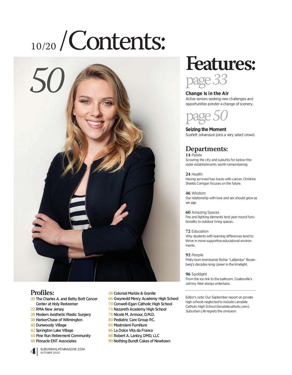 SL_TOC_10_20_TOC 10 / 23 / 20 7 : 59 AM Page 1 10 / 20 / Contents : Features : page33 - 50 Change Is in the Air Active seniors seeking new challenges and opportunities ponder a change of scenery . . page50 - Seizing the Moment Scarlett Johansson joins a very select crowd . Departments : 14 Palate Scouring the city and suburbs for below - the - radar establishments worth remembering . 24 Health Having survived two bouts with cancer , Christine Shields Corrigan focuses on the future . 46 Wisdom Our relationship with love and sex should grow as we age . 60 Amazing Spaces Fire and lighting elements lend year - round func - tionality to outdoor living spaces . 72 Education Why students with learning differences tend to thrive in more supportive educational environ - ments . 92 People Philly - born trombonist Richie “ LaBamba ” Rosen - berg’s decades - long career in the limelight . 96 Spotlight From the ice rink to the ballroom , Coatesville’s Johnny Weir always entertains . 58 Colonial Marble & Granite Profiles : Editor’s note : Our September report on private 66 Gwynedd Mercy Academy High School 20 The Charles A . and Betty Bott Cancer high schools neglected to include Lansdale 70 Conwell - Egan Catholic High School Center at Holy Redeemer Catholic High School ( lansdalecatholic.com ) . 74 Nazareth Academy High School 22 RMA New Jersey Suburban Life regrets the omission . 78 Nicole M . Armour , D.M.D . 28 Modern Aesthetic Plastic Surgery 80 Pediatric Care Group P.C . 38 HarborChase of Wilmington 84 Mastroieni Furniture 40 Dunwoody Village 86 La Dolce Vita da Franco 42 Springton Lake Village 88 Robert A . Lantzy , DMD , LLC 44 Pine Run Retirement Community 90 Nothing Bundt Cakes of Newtown 48 Pinnacle ENT Associates SUBURBANLIFEMAGAZINE.COM OCTOBER 2020 4 |
