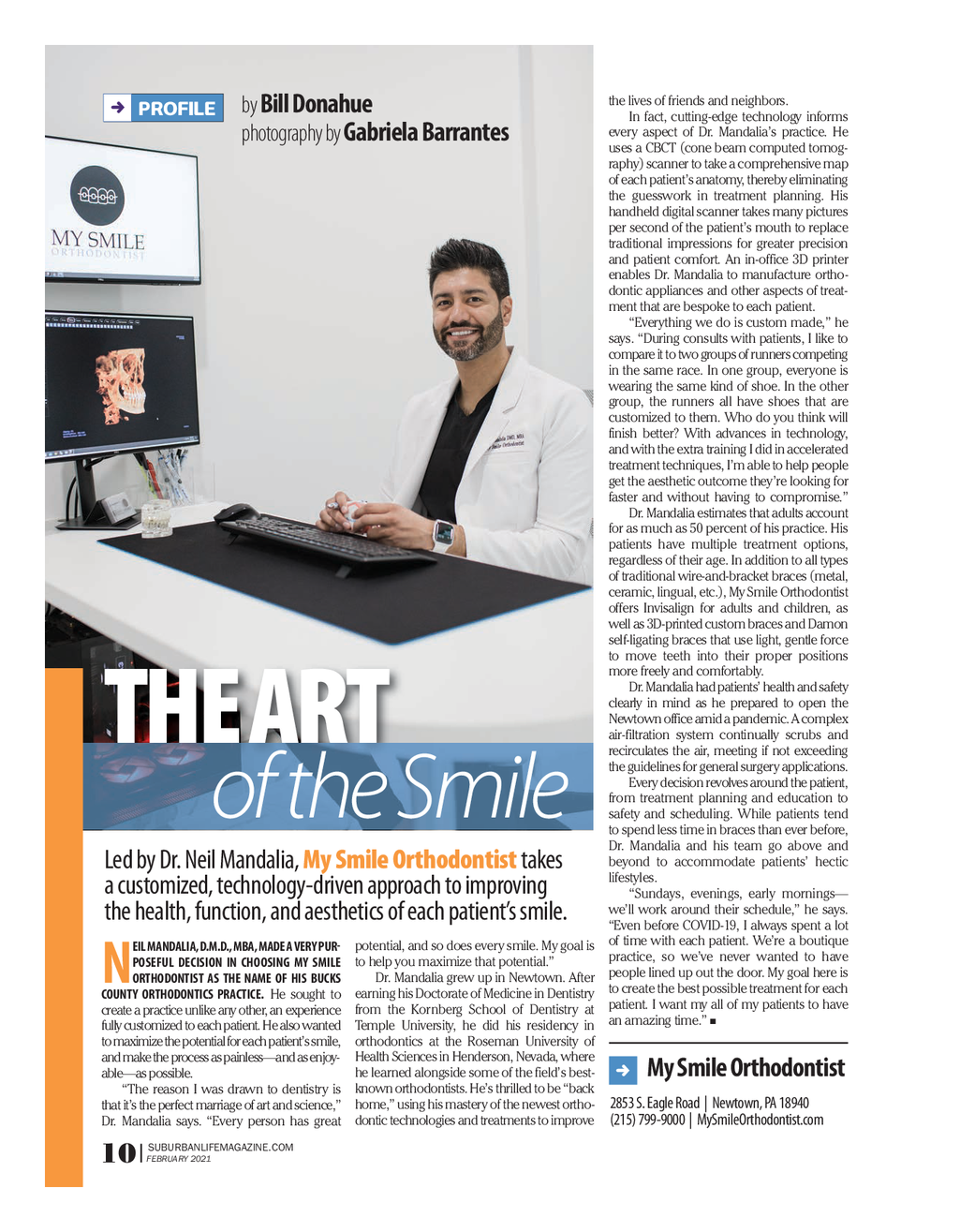 SL_MySmileOrthoProfile_0221final.qxp_Layout 1 2 / 22 / 21 5 : 37 PM Page 1 the lives of friends and neighbors . by Bill Donahue D PROFILE In fact , cutting - edge technology informs every aspect of Dr . Mandalia’s practice . He photography by Gabriela Barrantes uses a CBCT ( cone beam computed tomog - raphy ) scanner to take a comprehensive map of each patient’s anatomy , thereby eliminating the guesswork in treatment planning . His handheld digital scanner takes many pictures per second of the patient’s mouth to replace traditional impressions for greater precision and patient comfort . An in - office 3D printer enables Dr . Mandalia to manufacture ortho - dontic appliances and other aspects of treat - ment that are bespoke to each patient . “ Everything we do is custom made , ” he says . “ During consults with patients , I like to compare it to two groups of runners competing in the same race . In one group , everyone is wearing the same kind of shoe . In the other group , the runners all have shoes that are customized to them . Who do you think will finish better ? With advances in technology , and with the extra training I did in accelerated treatment techniques , I’m able to help people get the aesthetic outcome they’re looking for faster and without having to compromise . ” Dr . Mandalia estimates that adults account for as much as 50 percent of his practice . His patients have multiple treatment options , regardless of their age . In addition to all types of traditional wire - and - bracket braces ( metal , ceramic , lingual , etc . ) , My Smile Orthodontist offers Invisalign for adults and children , as well as 3D - printed custom braces and Damon self - ligating braces that use light , gentle force to move teeth into their proper positions more freely and comfortably . Dr . Mandalia had patients ’ health and safety clearly in mind as he prepared to open the Newtown office amid a pandemic . A complex air - filtration system continually scrubs and THEART recirculates the air , meeting if not exceeding the guidelines for general surgery applications . Every decision revolves around the patient , from treatment planning and education to ofthe Smile safety and scheduling . While patients tend to spend less time in braces than ever before , Dr . Mandalia and his team go above and beyond to accommodate patients ’ hectic Led by Dr . Neil Mandalia , My Smile Orthodontist takes lifestyles . a customized , technology - driven approach to improving “ Sundays , evenings , early mornings — we’ll work around their schedule , ” he says . the health , function , and aesthetics of each patient’s smile . “ Even before COVID - 19 , I always spent a lot of time with each patient . We’re a boutique potential , and so does every smile . My goal is EIL MANDALIA , D.M.D . , MBA , MADE A VERY PUR ? practice , so we’ve never wanted to have to help you maximize that potential . ” POSEFUL DECISION IN CHOOSING MY SMILE people lined up out the door . My goal here is Dr . Mandalia grew up in Newtown . After NORTHODONTIST AS THE NAME OF HIS BUCKS to create the best possible treatment for each earning his Doctorate of Medicine in Dentistry COUNTY ORTHODONTICS PRACTICE . He sought to patient . I want my all of my patients to have from the Kornberg School of Dentistry at create a practice unlike any other , an experience ? an amazing time . ” Temple University , he did his residency in fully customized to each patient . He also wanted orthodontics at the Roseman University of tomaximize the potential for each patient’s smile , Health Sciences in Henderson , Nevada , where andmake the process as painless — and as enjoy - My Smile Orthodontist he learned alongside some of the field’s best - D able — as possible . known orthodontists . He’s thrilled to be “ back “ The reason I was drawn to dentistry is 2853 S . Eagle Road | Newtown , PA 18940 home , ” using his mastery of the newest ortho - that it’s the perfect marriage of art and science , ” dontic technologies and treatments to improve ( 215 ) 799 - 9000 | MySmileOrthodontist.com Dr . Mandalia says . “ Every person has great SUBURBANLIFEMAGAZINE.COM FEBRUARY 2021 10 |