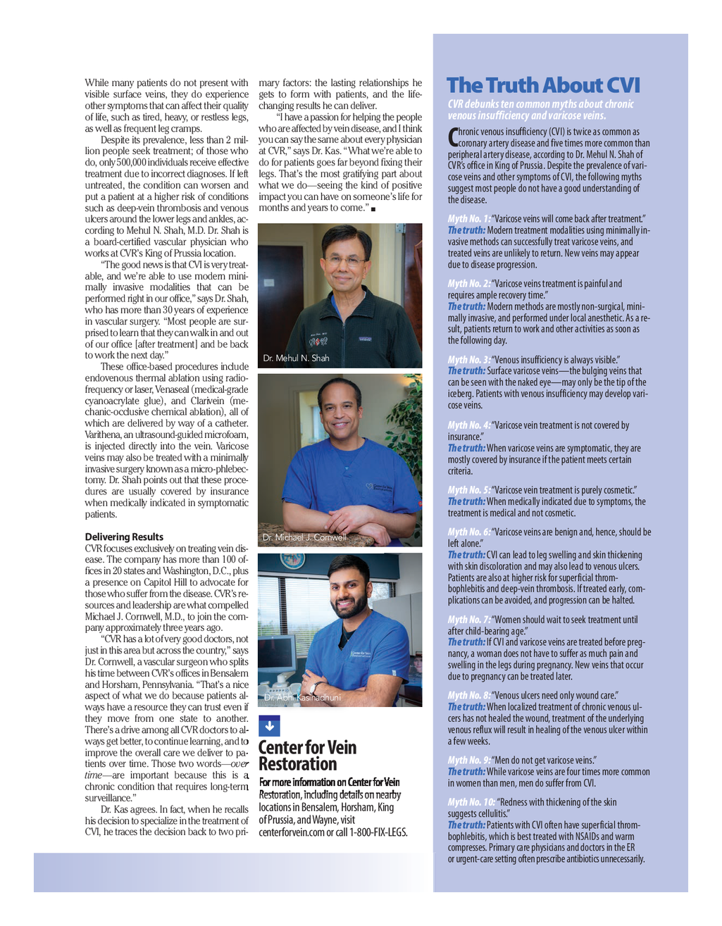 SL_Center for VeinProfile_0521FINAL.qxp_Layout 1 5 / 26 / 21 2 : 32 PM Page 2 mary factors : the lasting relationships he While many patients do not present with TheTruth About CVI gets to form with patients , and the life - visible surface veins , they do experience CVR debunks ten common myths about chronic changing results he can deliver . other symptoms that can affect their quality venous insufficiency and varicose veins . “ I have a passion for helping the people of life , such as tired , heavy , or restless legs , who are affected by vein disease , and I think as well as frequent leg cramps . hronic venous insufficiency ( CVI ) is twice as common as you can say the same about every physician Despite its prevalence , less than 2 mil - Ccoronary artery disease and five times more common than at CVR , ” says Dr . Kas . “ What we’re able to lion people seek treatment ; of those who peripheral artery disease , according to Dr . Mehul N . Shah of do for patients goes far beyond fixing their do , only 500,000 individuals receive effective CVR’s office in King of Prussia . Despite the prevalence of vari - legs . That’s the most gratifying part about treatment due to incorrect diagnoses . If left cose veins and other symptoms of CVI , the following myths what we do — seeing the kind of positive untreated , the condition can worsen and suggest most people do not have a good understanding of impact you can have on someone’s life for put a patient at a higher risk of conditions the disease . months and years to come . ” such as deep - vein thrombosis and venous ? Myth No . 1 : “ Varicose veins will come back after treatment . ” ulcers around the lower legs and ankles , ac - The truth : Modern treatment modalities using minimally in - cording to Mehul N . Shah , M.D . Dr . Shah is vasive methods can successfully treat varicose veins , and a board - certified vascular physician who treated veins are unlikely to return . New veins may appear works at CVR’s King of Prussia location . due to disease progression . “ The good news is that CVI is very treat - able , and we’re able to use modern mini - Myth No . 2 : “ Varicose veins treatment is painful and mally invasive modalities that can be requires ample recovery time . ” performed right in our office , ” says Dr . Shah , The truth : Modern methods are mostly non - surgical , mini - who has more than 30 years of experience mally invasive , and performed under local anesthetic . As a re - in vascular surgery . “ Most people are sur - sult , patients return to work and other activities as soon as prised to learn that they can walk in and out the following day . of our office [ after treatment ] and be back to work the next day . ” Dr . Mehul N . Shah Myth No . 3 : “ Venous insufficiency is always visible . ” These office - based procedures include The truth : Surface varicose veins — the bulging veins that endovenous thermal ablation using radio - can be seen with the naked eye — may only be the tip of the frequency or laser , Venaseal ( medical - grade iceberg . Patients with venous insufficiency may develop vari - cyanoacrylate glue ) , and Clarivein ( me - cose veins . chanic - occlusive chemical ablation ) , all of which are delivered by way of a catheter . Myth No . 4 : “ Varicose vein treatment is not covered by Varithena , an ultrasound - guided microfoam , insurance . ” is injected directly into the vein . Varicose The truth : When varicose veins are symptomatic , they are veins may also be treated with a minimally mostly covered by insurance if the patient meets certain invasive surgery known as a micro - phlebec - criteria . tomy . Dr . Shah points out that these proce - Myth No . 5 : “ Varicose vein treatment is purely cosmetic . ” dures are usually covered by insurance The truth : When medically indicated due to symptoms , the when medically indicated in symptomatic treatment is medical and not cosmetic . patients . Myth No . 6 : “ Varicose veins are benign and , hence , should be Delivering Results Dr . Michael J . Cornwell left alone . ” CVR focuses exclusively on treating vein dis - The truth : CVI can lead to leg swelling and skin thickening ease . The company has more than 100 of - with skin discoloration and may also lead to venous ulcers . fices in 20 states and Washington , D.C . , plus Patients are also at higher risk for superficial throm - a presence on Capitol Hill to advocate for bophlebitis and deep - vein thrombosis . If treated early , com - those who suffer from the disease . CVR’s re - plications can be avoided , and progression can be halted . sources and leadership are what compelled Michael J . Cornwell , M.D . , to join the com - Myth No . 7 : “ Women should wait to seek treatment until pany approximately three years ago . after child - bearing age . ” “ CVR has a lot of very good doctors , not The truth : If CVI and varicose veins are treated before preg - just in this area but across the country , ” says nancy , a woman does not have to suffer as much pain and Dr . Cornwell , a vascular surgeon who splits swelling in the legs during pregnancy . New veins that occur his time between CVR’s offices in Bensalem due to pregnancy can be treated later . and Horsham , Pennsylvania . “ That’s a nice Myth No . 8 : “ Venous ulcers need only wound care . ” aspect of what we do because patients al - Dr . Abhi Kasinadhuni The truth : When localized treatment of chronic venous ul - ways have a resource they can trust even if D cers has not healed the wound , treatment of the underlying they move from one state to another . venous reflux will result in healing of the venous ulcer within There’s a drive among all CVR doctors to al - a few weeks . ways get better , to continue learning , and to Center for Vein improve the overall care we deliver to pa - Myth No . 9 : “ Men do not get varicose veins . ” tients over time . Those two words — over Re