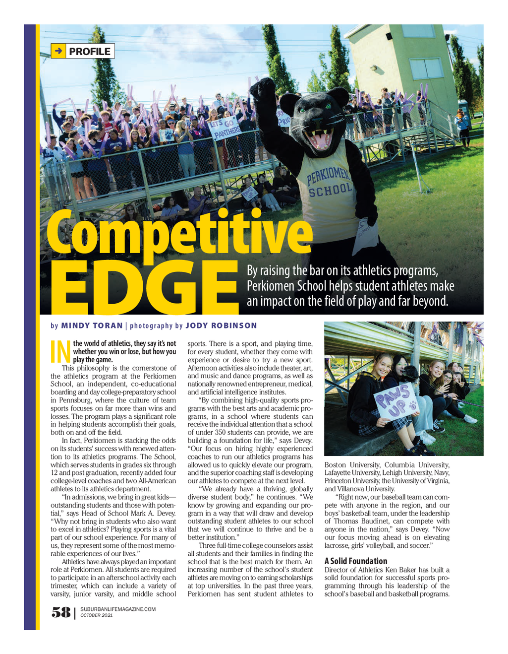 SL_PROFILE_Perkiomen_1021_Layout 1 11 / 1 / 21 1 : 16 PM Page 1 D PROFILE Competitive By raising the bar on its athletics programs , Perkiomen School helps student athletes make an impact on the field of play and far beyond . EDGE b y M I N DY TO R A N | p h o t o g r a p h y b y J O DY RO B I N S O N sports . There is a sport , and playing time , the world of athletics , they say it’s not for every student , whether they come with whether you win or lose , but how you play the game . experience or desire to try a new sport . IN Afternoon activities also include theater , art , This philosophy is the cornerstone of and music and dance programs , as well as the athletics program at the Perkiomen nationally renowned entrepreneur , medical , School , an independent , co - educational and artificial intelligence institutes . boarding and day college - preparatory school “ By combining high - quality sports pro - in Pennsburg , where the culture of team grams with the sports focuses on far more than wins and best arts and academic pro - losses . The program plays a significant role grams , in a school where students can in helping students accomplish their goals , receive the individual attention that a school both on and off the field . of under 350 students can provide , we are In fact , Perkiomen is stacking the odds building a foundation for life , ” says Devey . on its students ’ success with renewed atten - “ Our focus on hiring highly experienced tion to its athletics programs . The School , coaches to run our athletics programs has which serves students in grades six through allowed us to quickly elevate our program , Boston University , Columbia University , 12 and post graduation , recently added four and the superior coaching staff is developing Lafayette University , Lehigh University , Navy , college - level coaches and two All - American our athletes to compete at the next level . Princeton University , the University of Virginia , athletes to its athletics department . “ We already have a thriving , globally and Villanova University . “ In admissions , we bring in great kids — diverse student body , ” he continues . “ We “ Right now , our baseball team can com - outstanding students and those with poten - know by growing and expanding our pro - pete with anyone in the region , and our tial , ” gram in a way that will draw and develop boys ’ basketball team , under the leadership says Head of School Mark A . Devey . outstanding student athletes to our school of Thomas Baudinet , can compete with “ Why not bring in students who also want that we will continue to thrive and be a anyone in the nation , ” says Devey . “ Now to excel in athletics ? Playing sports is a vital better institution . ” our focus moving ahead is on elevating part of our school experience . For many of Three full - time college counselors assist lacrosse , girls ’ volleyball , and soccer . ” us , they represent some of the most memo - all students and their families in finding the rable experiences of our lives . ” school that is the best match Athletics have always played an important for them . An A Solid Foundation role at Perkiomen . All students are required increasing number of the school’s student Director of Athletics Ken Baker has built a to participate in an afterschool activity each athletes are moving on to earning scholarships solid foundation for successful sports pro - trimester , which can include a variety of at top universities . In the past three years , gramming through his leadership of the varsity , junior varsity , and middle school Perkiomen has sent student athletes to school’s baseball and basketball programs . SUBURBANLIFEMAGAZINE.COM OCTOBER 2021 58 |