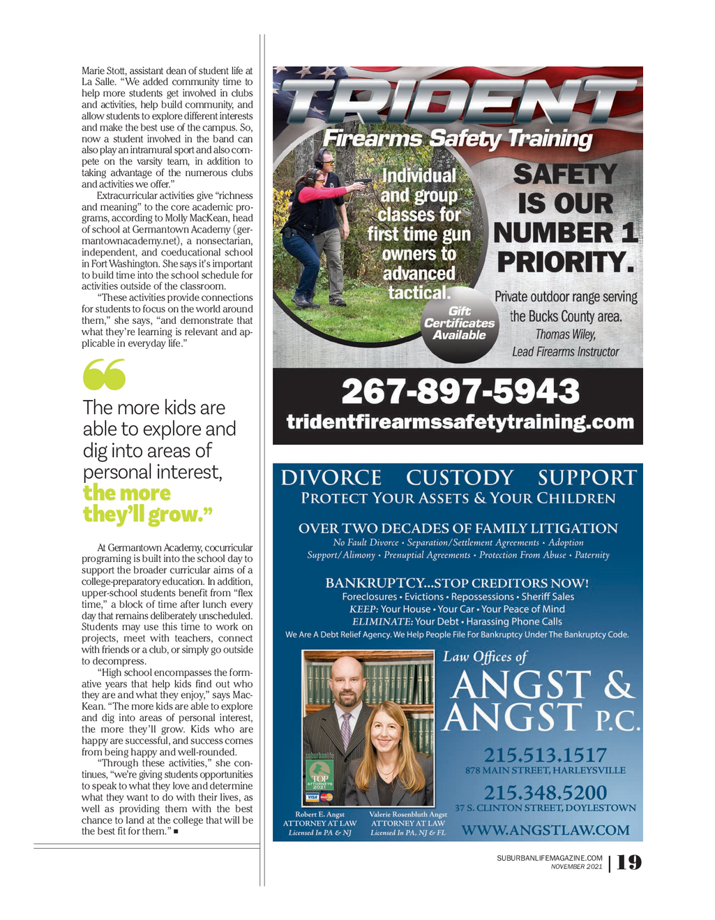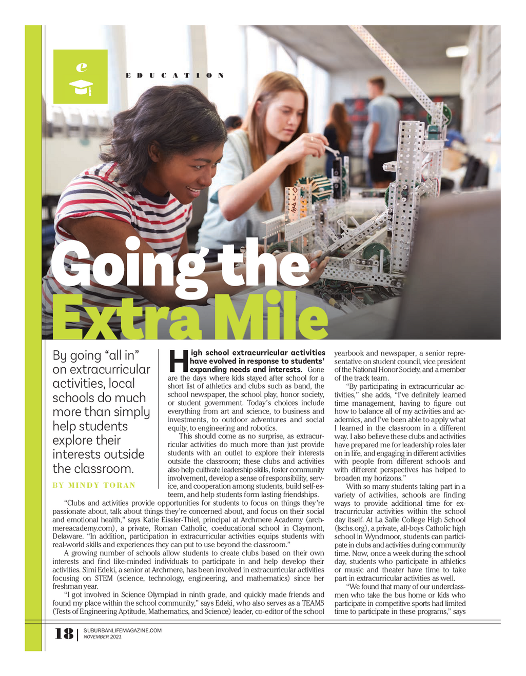 SL_Education_1121_Layout 1 12 / 1 / 21 1 : 18 PM Page 1 e E D U C A T I O N Going the Extra Mile igh school extracurricular activities yearbook and newspaper , a senior repre - By going “ all in ” have evolved in response to students ’ sentative on student council , vice president Hexpanding needs and interests . Gone ofthe National Honor Society , and a member on extracurricular are the days where kids stayed after school for a of the track team . activities , local short list of athletics and clubs such as band , the “ By participating in extracurricular ac - school newspaper , the school play , honor society , tivities , ” she adds , “ I’ve definitely learned schools do much or student government . Today’s choices include time management , having to figure out everything from art and science , to business and how to balance all of my activities and ac - more than simply investments , to outdoor adventures and social ademics , and I’ve been able to apply what help students equity , to engineering and robotics . I learned in the classroom in a different This should come as no surprise , as extracur - way . I also believe these clubs and activities explore their ricular activities do much more than just provide haveprepared me for leadership roles later students with an outlet to explore their interests on in life , and engaging in different activities interests outside outside the classroom ; these clubs and activities with people from different schools and also help cultivate leadership skills , foster community with different perspectives has helped to the classroom . involvement , develop a sense of responsibility , serv - broadenmy horizons . ” BY MINDY TORAN ice , and cooperation among students , build self - es - With so many students taking part in a teem , and help students form lasting friendships . variety of activities , schools are finding “ Clubs and activities provide opportunities for students to focus on things they’re ways to provide additional time for ex - passionate about , talk about things they’re concerned about , and focus on their social tracurricular activities within the school and emotional health , ” says Katie Eissler - Thiel , principal at Archmere Academy ( arch - day itself . At La Salle College High School mereacademy.com ) , a private , Roman Catholic , coeducational school in Claymont , ( lschs.org ) , a private , all - boys Catholic high Delaware . “ In addition , participation in extracurricular activities equips students with school in Wyndmoor , students can partici - real - world skills and experiences they can put to use beyond the classroom . ” pate in clubs and activities during community A growing number of schools allow students to create clubs based on their own time . Now , once a week during the school interests and find like - minded individuals to participate in and help develop their day , students who participate in athletics activities . Simi Edeki , a senior at Archmere , has been involved in extracurricular activities or music and theater have time to take focusing on STEM ( science , technology , engineering , and mathematics ) since her part in extracurricular activities as well . freshman year . “ We found that many of our underclass - “ I got involved in Science Olympiad in ninth grade , and quickly made friends and men who take the bus home or kids who found my place within the school community , ” says Edeki , who also serves as a TEAMS participate in competitive sports had limited ( Tests of Engineering Aptitude , Mathematics , and Science ) leader , co - editor of the school time to participate in these programs , ” says SUBURBANLIFEMAGAZINE.COM NOVEMBER 2021 18 |