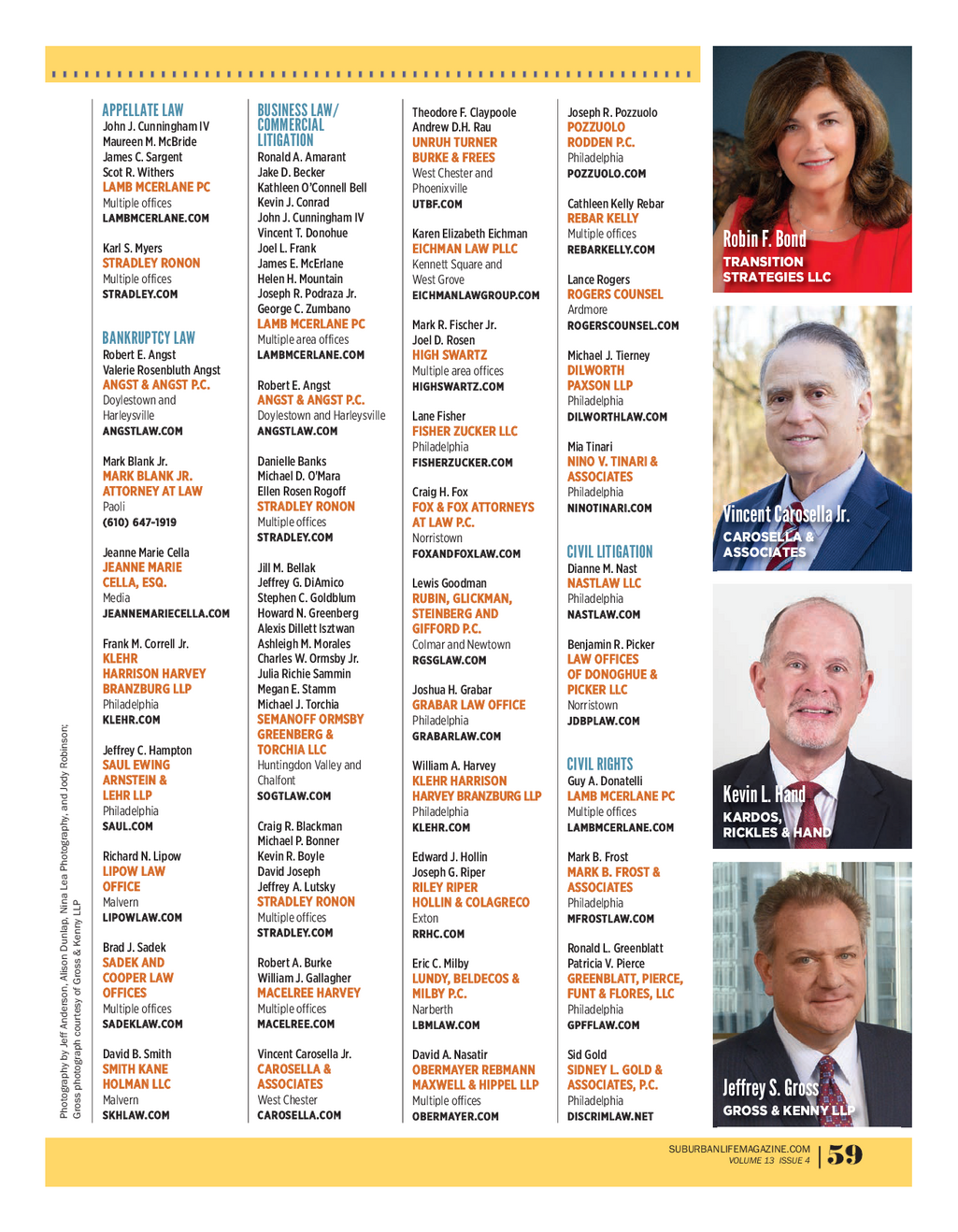 SL_FEATURE_Top_Attorneys_1221_Feature 12 / 28 / 21 10 : 01 AM Page 2 APPELLATE LAW BUSINESS LAW / Theodore F . Claypoole Joseph R . Pozzuolo John J . Cunningham IV COMMERCIAL POZZUOLO Andrew D.H . Rau Maureen M . McBride LITIGATION UNRUH TURNER RODDEN P.C . James C . Sargent Ronald A . Amarant BURKE & FREES Philadelphia Scot R . Withers Jake D . Becker West Chester and POZZUOLO.COM LAMB MCERLANE PC Kathleen O’Connell Bell Phoenixville Multiple offices Kevin J . Conrad UTBF.COM Cathleen Kelly Rebar LAMBMCERLANE.COM John J . Cunningham IV REBAR KELLY Vincent T . Donohue Karen Elizabeth Eichman Multiple offices Robin F . Bond Karl S . Myers Joel L . Frank EICHMAN LAW PLLC REBARKELLY.COM TRANSITION STRADLEY RONON James E . McErlane Kennett Square and STRATEGIES LLC Multiple offices Helen H . Mountain West Grove Lance Rogers STRADLEY.COM Joseph R . Podraza Jr . ROGERS COUNSEL EICHMANLAWGROUP.COM George C . Zumbano Ardmore LAMB MCERLANE PC Mark R . Fischer Jr . ROGERSCOUNSEL.COM BANKRUPTCY LAW Multiple area offices Joel D . Rosen LAMBMCERLANE.COM Robert E . Angst HIGH SWARTZ Michael J . Tierney Valerie Rosenbluth Angst DILWORTH Multiple area offices ANGST & ANGST P.C . Robert E . Angst PAXSON LLP HIGHSWARTZ.COM ANGST & ANGST P.C . Doylestown and Philadelphia Harleysville Doylestown and Harleysville Lane Fisher DILWORTHLAW.COM ANGSTLAW.COM ANGSTLAW.COM FISHER ZUCKER LLC Philadelphia Mia Tinari Mark Blank Jr . Danielle Banks NINO V . TINARI & FISHERZUCKER.COM MARK BLANK JR . Michael D . O'Mara ASSOCIATES ATTORNEY AT LAW Ellen Rosen Rogoff Craig H . Fox Philadelphia STRADLEY RONON Paoli FOX & FOX ATTORNEYS NINOTINARI.COM Vincent Carosella Jr . ( 610 ) 647 - 1919 Multiple offices AT LAW P.C . STRADLEY.COM CAROSELLA & Norristown Jeanne Marie Cella ASSOCIATES CIVIL LITIGATION FOXANDFOXLAW.COM JEANNE MARIE Jill M . Bellak Dianne M . Nast CELLA , ESQ . Jeffrey G . DiAmico NASTLAW LLC Lewis Goodman Media Stephen C . Goldblum RUBIN , GLICKMAN , Philadelphia JEANNEMARIECELLA.COM Howard N . Greenberg STEINBERG AND NASTLAW.COM Alexis Dillett Isztwan GIFFORD P.C . Frank M . Correll Jr . Ashleigh M . Morales Colmar and Newtown Benjamin R . Picker KLEHR Charles W . Ormsby Jr . LAW OFFICES RGSGLAW.COM HARRISON HARVEY Julia Richie Sammin OF DONOGHUE & BRANZBURG LLP Megan E . Stamm PICKER LLC Joshua H . Grabar Philadelphia Michael J . Torchia GRABAR LAW OFFICE Norristown KLEHR.COM SEMANOFF ORMSBY on ; Philadelphia JDBPLAW.COM GREENBERG & GRABARLAW.COM ins TORCHIA LLC Jeffrey C . Hampton Rob SAUL EWING Huntingdon Valley and CIVIL RIGHTS William A . Harvey dy ARNSTEIN & Chalfont KLEHR HARRISON Guy A . JoDonatelli d LEHR LLP SOGTLAW.COM HARVEY BRANZBURG LLP LAMB MCERLANE PC Kevin L . Hand an Philadelphia Philadelphia Multiple y , offices KARDOS , h pSAUL.COM Craig R . Blackman KLEHR.COM LAMBMCERLANE.COM gra RICKLES & HAND Michael P . Bonner oto Richard N . Lipow Kevin R . Boyle Edward J . Hollin Mark B . Frost Ph LIPOW LAW David Joseph MARK B . FROST & Joseph G . Riper Lea OFFICE Jeffrey A . Lutsky RILEY RIPER ASSOCIATES na P STRADLEY RONON Malvern HOLLIN & iCOLAGRECO Philadelphia LL N , KennyLIPOWLAW.COM Multiple offices Exton MFROSTLAW.COM Dunlap STRADLEY.COM RRHC.COM Brad J . Sadek Ronald L . Greenblatt & on s SADEK AND Robert A . Burke Eric C . Milby Patricia V . rosPierce Alis COOPER LAW William J . Gallagher LUNDY , BELDECOS & GREENBLATT , PIERCE , G n , of OFFICES MACELREE oHARVEY MILBY P.C . FUNT & FLORES , LLC ers sy Multiple offices Multiple eoffices Narberth Philadelphia urt nd SADEKLAW.COM AMACELREE.COM LBMLAW.COM GPFFLAW.COM co Jeff aph y David B . Smith Vincent Carosella Jr . David A . Nasatir Sid rGold b og hy SMITH KANE CAROSELLA & t OBERMAYER REBMANN SIDNEY L . GOLD & rap ho HOLMAN LLC ASSOCIATES MAXWELL & HIPPEL LLP ASSOCIATES , P.C . p g Jeffrey S . Gross ss to Malvern West Chester Multiple offices Philadelphia ho ro GROSS & KENNY LLP P G SKHLAW.COM CAROSELLA.COM OBERMAYER.COM DISCRIMLAW.NET SUBURBANLIFEMAGAZINE.COM VOLUME 13 ISSUE 4 | 59