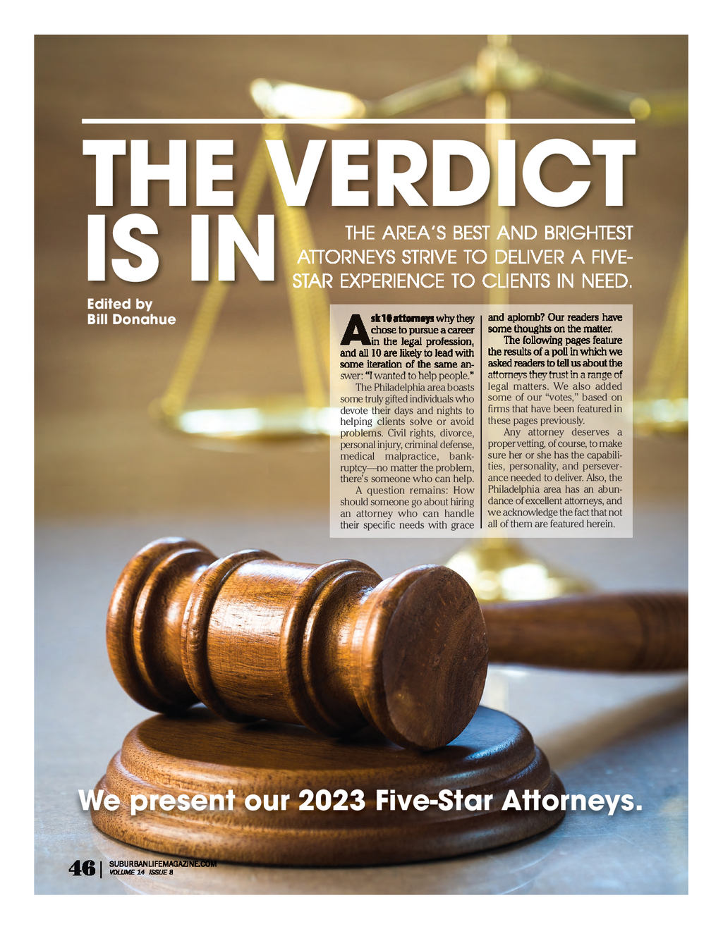 SL_TopAttorneys_0423xFINAL.qxp_Layout 1 4 / 28 / 23 3 : 51 PM Page 1 THE VERDICT THE AREA’S BEST AND BRIGHTEST ATTORNEYS STRIVE TO DELIVER A FIVE - IS IN STAR EXPERIENCE TO CLIENTS IN NEED . Edited by and aplomb ? Our readers have sk 10 attorneys why they Bill Donahue some thoughts on the matter . chose to pursue a career The following pages feature Ain the legal profession , the results of a poll in which we and all 10 are likely to lead with askedreaders to tell us about the some iteration of the same an - attorneys they trust in a range of swer : “ I wanted to help people . ” legal matters . We also added ThePhiladelphia area boasts some of our “ votes , ” based on some truly gifted individuals who firms that have been featured in devote their days and nights to these pages previously . helping clients solve or avoid Any attorney deserves a problems . Civil rights , divorce , propervetting , of course , to make personalinjury , criminal defense , sure her or she has the capabili - medical malpractice , bank - ties , personality , and persever - ruptcy — no matter the problem , anceneeded to deliver . Also , the there’s someone who can help . Philadelphia area has an abun - A question remains : How dance of excellent attorneys , and shouldsomeone go about hiring weacknowledge the fact that not an attorney who can handle all of them are featured herein . their specific needs with grace We present our 2023 Five - Star Attorneys . SUBURBANLIFEMAGAZINE.COM VOLUME 14 ISSUE 8 46 |