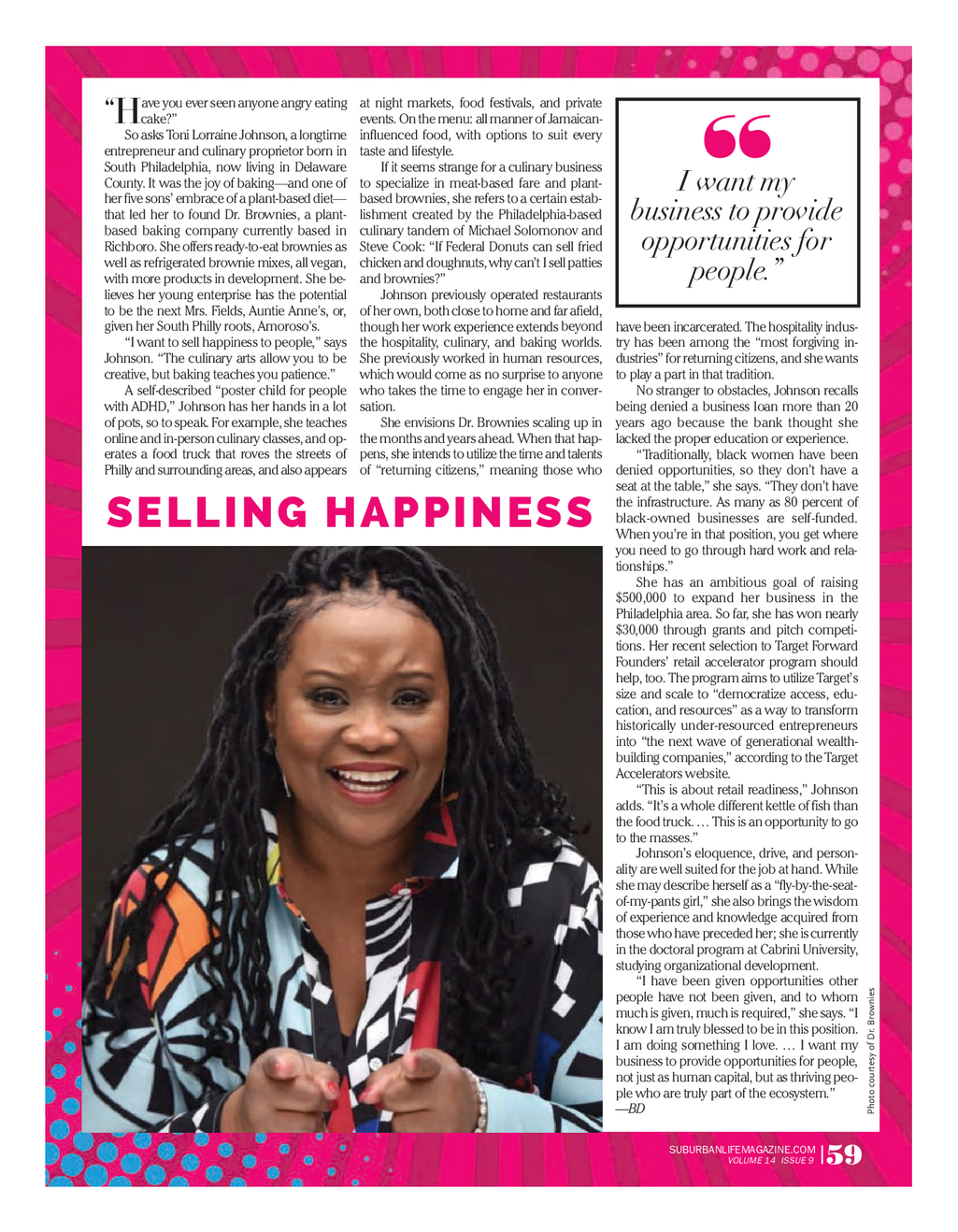SL_Super Women_0523FINAL.qxp_Profile ( Dept . ) 5 / 31 / 23 1 : 15 PM Page 5 ? ? ave you ever seen anyone angry eating at night markets , food festivals , and private “ Hcake ? ” events . On the menu : all manner of Jamaican - So asks Toni Lorraine Johnson , a longtime influenced food , with options to suit every entrepreneur and culinary proprietor born in taste and lifestyle . South Philadelphia , now living in Delaware If it seems strange for a culinary business County . It was the joy of baking — and one of to specialize in meat - based fare and plant - I want my her five sons ’ embrace of a plant - based diet — based brownies , she refers to a certain estab - that led her to found Dr . Brownies , a plant - lishment created by the Philadelphia - based business to provide based baking company currently based in culinary tandem of Michael Solomonov and opportunities for Richboro . She offers ready - to - eat brownies as Steve Cook : “ If Federal Donuts can sell fried well as refrigerated brownie mixes , all vegan , chicken and doughnuts , why can’t I sell patties people . ” with more products in development . She be - and brownies ? ” lieves her young enterprise has the potential Johnson previously operated restaurants to be the next Mrs . Fields , Auntie Anne’s , or , of her own , both close to home and far afield , given her South Philly roots , Amoroso’s . beyond though her work experience extends have been incarcerated . The hospitality indus - “ I want to sell happiness to people , ” says the hospitality , culinary , and baking worlds . try has been among the “ most forgiving in - Johnson . “ The culinary arts allow you to be She previously worked in human resources , dustries ” for returning citizens , and she wants creative , but baking teaches you patience . ” which would come as no surprise to anyone to play a part in that tradition . A self - described “ poster child for people who takes the time to engage her in conver - No stranger to obstacles , Johnson recalls in a lot with ADHD , ” Johnson has her hands sation . being denied a business loan more than 20 of pots , so to speak . For example , she teaches She envisions Dr . Brownies scaling up in years ago because the bank thought she online and in - person culinary classes , and op - the months and years ahead . When that hap - lacked the proper education or experience . erates a food truck that roves the streets of pens , she intends to utilize the time and talents “ Traditionally , black women have been Philly and surrounding areas , and also appears of “ returning citizens , ” meaning those who denied opportunities , so they don’t have a seat at the table , ” she says . “ They don’t have the infrastructure . As many as 80 percent of black - owned businesses are self - funded . SELLING HAPPINESS When you’re in that position , you get where you need to go through hard work and rela - tionships . ” She has an ambitious goal of raising $ 500,000 to expand her business in the Philadelphia area . So far , she has won nearly $ 30,000 through grants and pitch competi - tions . Her recent selection to Target Forward Founders ’ retail accelerator program should help , too . The program aims to utilize Target’s size and scale to “ democratize access , edu - cation , and resources ” as a way to transform historically under - resourced entrepreneurs into “ the next wave of generational wealth - building companies , ” according to the Target Accelerators website . “ This is about retail readiness , ” Johnson adds . “ It’s a whole different kettle of fish than food truck . … This is an opportunity to go the to the masses . ” Johnson’s eloquence , drive , and person - ality are well suited for the job at hand . While she may describe herself as a “ fly - by - the - seat - of - my - pants girl , ” she also brings the wisdom of experience and knowledge acquired from those who have preceded her ; she is currently in the doctoral program at Cabrini University , studying organizational development . “ I have been given opportunities other ies people have not been given , and to whom own much is given , much is required , ” she says . “ I Br r . know I am truly blessed to be in this position . D f I am doing something I love . … I want my o sy business to provide opportunities for people , urte not just as human capital , but as thriving peo - co o ecosystem . ” ple who are truly part of the hot — BD P SUBURBANLIFEMAGAZINE.COM VOLUME 14 ISSUE 9 | 59