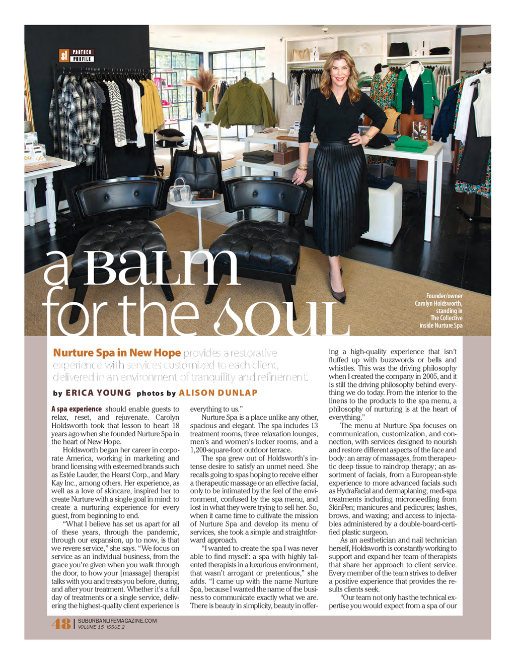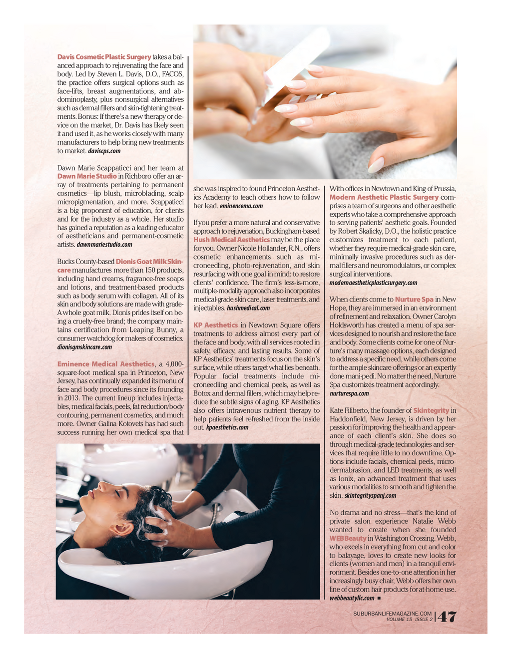 SL_Beauty Feature_1023FINAL.qxp_Profile ( Dept . ) 11 / 1 / 23 12 : 50 PM Page 2 Davis Cosmetic Plastic Surgerytakes a bal - anced approach to rejuvenating the face and body . Led by Steven L . Davis , D.O . , FACOS , the practice offers surgical options such as face - lifts , breast augmentations , and ab - dominoplasty , plus nonsurgical alternatives such as dermal fillers and skin - tightening treat - ments . Bonus : If there’s a new therapy or de - vice on the market , Dr . Davis has likely seen it and used it , as he works closely with many manufacturers to help bring new treatments to market . daviscps.com Dawn Marie Scappaticci and her team at Dawn Marie Studio in Richboro offer an ar - ray of treatments pertaining to permanent shewas inspired to found Princeton Aesthet - Withoffices in Newtown and King of Prussia , cosmetics — lip blush , microblading , scalp ics Academy to teach others how to follow Modern Aesthetic Plastic Surgery com - micropigmentation , and more . Scappaticci her lead . eminencema.com prisesa team of surgeons and other aesthetic is a big proponent of education , for clients expertswho take a comprehensive approach and for the industry as a whole . Her studio If you prefer a more natural and conservative to serving patients ’ aesthetic goals . Founded hasgained a reputation as a leading educator approachto rejuvenation , Buckingham - based byRobert Skalicky , D.O . , the holistic practice of aestheticians and permanent - cosmetic HushMedical Aestheticsmay be the place customizes treatment to each patient , artists . dawnmariestudio.com foryou . Owner Nicole Hollander , R.N . , offers whetherthey require medical - grade skin care , cosmetic enhancements such as mi - minimally invasive procedures such as der - BucksCounty - based Dionis Goat Milk Skin - croneedling , photo - rejuvenation , and skin mal fillers and neuromodulators , or complex caremanufacturesmore than 150 products , resurfacingwith one goal in mind : to restore surgicalinterventions . including hand creams , fragrance - free soaps clients ’ confidence . The firm’s less - is - more , modernaestheticplasticsurgery.com and lotions , and treatment - based products multiple - modalityapproach also incorporates such as body serum with collagen . All of its medical - gradeskin care , laser treatments , and When clients come to Nurture Spa in New skinand body solutions are made with grade - injectables.hushmedical.com Hope , they are immersed in an environment Awhole goat milk . Dionis prides itself on be - ofrefinement and relaxation . Owner Carolyn ing a cruelty - free brand ; the company main - KP Aesthetics in Newtown Square offers Holdsworth has created a menu of spa ser - tains certification from Leaping Bunny , a treatments to address almost every part of vicesdesigned to nourish and restore the face consumerwatchdog for makers of cosmetics . theface and body , with all services rooted in andbody . Some clients come for one of Nur - dionisgmskincare.com safety , efficacy , and lasting results . Some of ture’smany massage options , each designed KP Aesthetics ’ treatments focus on the skin’s toaddress a specific need , while others come Eminence Medical Aesthetics , a 4,000 - others target what lies beneath . surface , while forthe ample skincare offerings or an expertly square - foot medical spa in Princeton , New Popular facial treatments include mi - donemani - pedi . No matter the need , Nurture Jersey , has continually expanded its menu of croneedling and chemical peels , as well as Spacustomizes treatment accordingly . face and body procedures since its founding Botoxand dermal fillers , which may help re - nurturespa.com in 2013 . The current lineup includes injecta - duce the subtle signs of aging . KP Aesthetics bles , medical facials , peels , fat reduction / body also offers intravenous nutrient therapy to Kate Filiberto , the founder of Skintegrity in contouring , permanent cosmetics , and much help patients feel refreshed from the inside Haddonfield , New Jersey , is driven by her Galina Kotovets has had such more.Owner out . kpaesthetics.com passionfor improving the health and appear - success running her own medical spa that ance of each client’s skin . She does so through medical - grade technologies and ser - vices that require little to no downtime . Op - tions include facials , chemical peels , micro - dermabrasion , and LED treatments , as well as Ionix , an advanced treatment that uses various modalities to smooth and tighten the skin . skintegrityspanj.com No drama and no stress — that’s the kind of private salon experience Natalie Webb wanted to create when she founded WEBBeautyin Washington Crossing . Webb , who excels in everything from cut and color to balayage , loves to create new looks for clients ( women and men ) in a tranquil envi - ronment . Besides one - to - one attention in her increasingly busy chair , Webb offers her own line of custom hair products for at - home use . ? webbeautyllc.com SUBURBANLIFEMAGAZINE.COM VOLUME 15 ISSUE 2 | 47