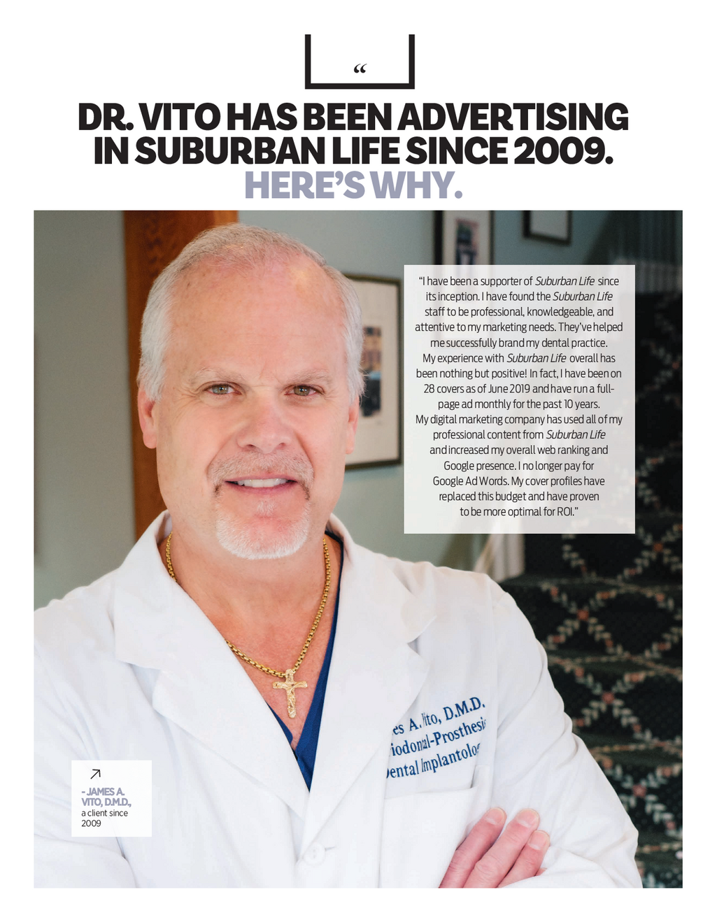 JamesVitoDMD_Testimonial_1_22_Layout 1 1 / 28 / 22 3 : 48 PM Page 1 DR . VITO HAS BEEN ADVERTISING IN SUBURBAN LIFE SINCE 2009 . HERE’S WHY . “ I have been a supporter of Suburban Life since its inception . I have found the Suburban Life staff to be professional , knowledgeable , and attentive to my marketing needs . They’ve helped me successfully brand my dental practice . My experience with Suburban Life overall has been nothing but positive ! In fact , I have been on 28 covers as of June 2019 and have run a full - page ad monthly for the past 10 years . My digital marketing company has used all of my professional content from Suburban Life and increased my overall web ranking and Google presence . I no longer pay for Google Ad Words . My cover profiles have replaced this budget and have proven to be more optimal for ROI . ” g - JAMES A . VITO , D.M.D . , a client since 2009