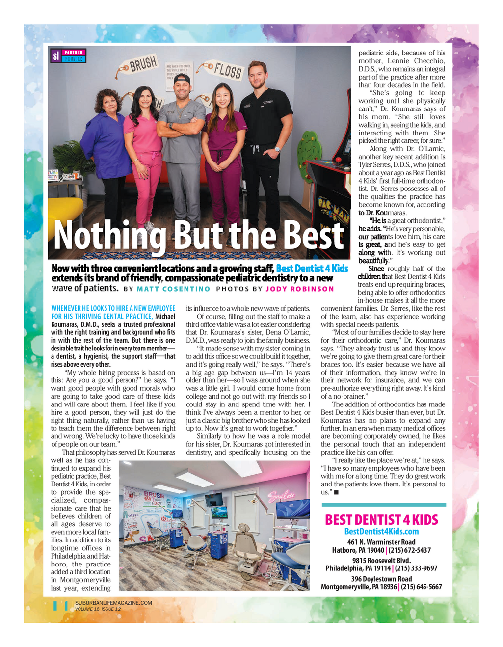 1025_Best Dentist 4 Kids_profile_Layout 1 11 / 25 / 25 11 : 46 AM Page 1 pediatric side , because of his mother , Lennie Checchio , D.D.S . , who remains an integral part of the practice after more than four decades in the field . “ She’s going to keep working until she physically can’t , ” Dr . Koumaras says of his mom . “ She still loves walking in , seeing the kids , and interacting with them . She picked the right career , for sure . ” Along with Dr . O’Larnic , another key recent addition is Tyler Serres , D.D.S . , who joined about a year ago as Best Dentist 4 Kids ’ first full - time orthodon - tist . Dr . Serres possesses all of the qualities the practice has become known for , according to Dr . Koumaras . “ He is a great orthodontist , ” he adds . “ He’s very personable , our patients love him , his care is great , and he’s easy to get NothingBut the Best along with . It’s working out beautifully . ” Since roughly half of the Nowwith three convenient locations and a growing staff , Best Dentist 4 Kids children that Best Dentist 4 Kids extends its brand of friendly , compassionate pediatric dentistry to a new treats end up requiring braces , waveof patients . B Y M AT T C O S E N T I N O P H O T O S B Y J O D Y R O B I N S O N being able to offer orthodontics in - house makes it all the more Whenever he looks to hire a neW employee its influence to a whole new wave of patients . convenient families . Dr . Serres , like the rest for his thriving dental practice , michael Of course , filling out the staff to make a of the team , also has experience working koumaras , d.m.d . , seeks a trusted professional third office viable was a lot easier considering with special needs patients . with the right training and background who fits that Dr . Koumaras’s sister , Dena O’Larnic , “ Most of our families decide to stay here in with the rest of the team . But there is one D.M.D . , was ready to join the family business . for their orthodontic care , ” Dr . Koumaras desirable trait he looks for in every team member — “ It made sense with my sister coming in says . “ They already trust us and they know a dentist , a hygienist , the support staff — that to add this office so we could build it together , we’re going to give them great care for their rises above every other . and it’s going really well , ” he says . “ There’s braces too . It’s easier because we have all “ My whole hiring process is based on a big age gap between us — I’m 14 years of their information , they know we’re in this : Are you a good person ? ” he says . “ I older than her — so I was around when she their network for insurance , and we can want good people with good morals who was a little girl . I would come home from pre - authorize everything right away . It’s kind are going to take good care of these kids college and not go out with my friends so I of a no - brainer . ” and will care about them . I feel like if you could stay in and spend time with her . I The addition of orthodontics has made hire a good person , they will just do the think I’ve always been a mentor to her , or Best Dentist 4 Kids busier than ever , but Dr . right thing naturally , rather than us having just a classic big brother who she has looked Koumaras has no plans to expand any to teach them the difference between right up to . Now it’s great to work together . ” further . In an era when many medical offices and wrong . We’re lucky to have those kinds Similarly to how he was a role model are becoming corporately owned , he likes of people on our team . ” for his sister , Dr . Koumaras got interested in the personal touch that an independent That philosophy has served Dr . Koumaras dentistry , and specifically focusing on the practice like his can offer . well as he has con - “ I really like the place we’re at , ” he says . tinued to expand his “ I have so many employees who have been pediatric practice , Best with me for a long time . They do great work Dentist 4 Kids , in order and the patients love them . It’s personal to to provide the spe - us . ” cialized , compas - sionate care that he believes children of BEST DENTIST 4 KIDS all ages deserve to BestDentist4Kids.com even more local fam - ilies . In addition to its 461N . Warminster Road longtime offices in Hatboro , PA 19040 | ( 215 ) 672 - 5437 Philadelphia and Hat - 9815Roosevelt Blvd . boro , the practice Philadelphia , PA 19114 | ( 215 ) 333 - 9697 added a third location 396Doylestown Road in Montgomeryville Montgomeryville , PA 18936 | ( 215 ) 645 - 5667 last year , extending SUBURBANLIFEMAGAZINE.COM VOLUME 16 ISSUE 12 14 |