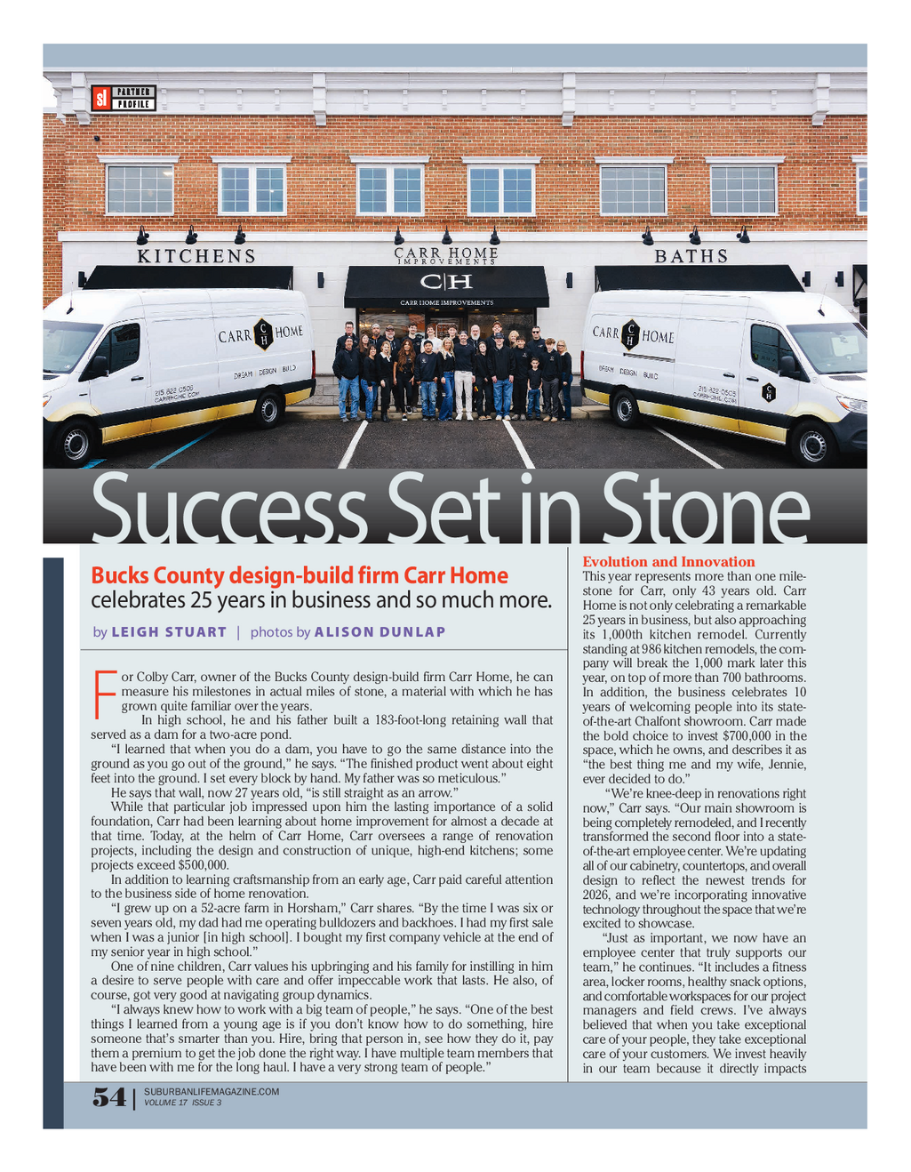 0126_Carr Home_profile_Layout 1 3 / 2 / 26 9 : 42 AM Page 1 Success Set in Stone Evolution and Innovation This year represents more than one mile - Bucks County design - build firm Carr Home stone for Carr , only 43 years old . Carr celebrates 25 years in business and so much more . Home is not only celebrating a remarkable 25 years in business , but also approaching by L E I G H S T UA R T | photos by A L I S O N D U N L A P its 1,000th kitchen remodel . Currently standing at 986 kitchen remodels , the com - pany will break the 1,000 mark later this or Colby Carr , owner of the Bucks County design - build firm Carr Home , he can year , on top of more than 700 bathrooms . measure his milestones in actual miles of stone , a material with which he has In addition , the business celebrates 10 grown quite familiar over the years . years of welcoming people into its state - F In high school , he and his father built a 183 - foot - long retaining wall that of - the - art Chalfont showroom . Carr made served as a dam for a two - acre pond . the bold choice to invest $ 700,000 in the “ I learned that when you do a dam , you have to go the same distance into the space , which he owns , and describes it as ground as you go out of the ground , ” he says . “ The finished product went about eight “ the best thing me and my wife , Jennie , feet into the ground . I set every block by hand . My father was so meticulous . ” ever decided to do . ” He says that wall , now 27 years old , “ is still straight as an arrow . ” “ We’reknee - deep in renovations right While that particular job impressed upon him the lasting importance of a solid now , ” Carr says . “ Our main showroom is foundation , Carr had been learning about home improvement for almost a decade at beingcompletely remodeled , and I recently that time . Today , at the helm of Carr Home , Carr oversees a range of renovation transformed the second floor into a state - projects , including the design and construction of unique , high - end kitchens ; some of - the - art employee center . We’re updating projects exceed $ 500,000 . all of our cabinetry , countertops , and overall In addition to learning craftsmanship from an early age , Carr paid careful attention design to reflect the newest trends for to the business side of home renovation . 2026 , and we’re incorporating innovative “ I grew up on a 52 - acre farm in Horsham , ” Carr shares . “ By the time I was six or technologythroughout the space that we’re seven years old , my dad had me operating bulldozers and backhoes . I had my first sale excited to showcase . when I was a junior [ in high school ] . I bought my first company vehicle at the end of “ Just as important , we now have an my senior year in high school . ” employee center that truly supports our One of nine children , Carr values his upbringing and his family for instilling in him team , ” he continues . “ It includes a fitness a desire to serve people with care and offer impeccable work that lasts . He also , of area , locker rooms , healthy snack options , course , got very good at navigating group dynamics . andcomfortable workspaces for our project “ I always knew how to work with a big team of people , ” he says . “ One of the best managers and field crews . I’ve always things I learned from a young age is if you don’t know how to do something , hire believed that when you take exceptional someone that’s smarter than you . Hire , bring that person in , see how they do it , pay care of your people , they take exceptional them a premium to get the job done the right way . I have multiple team members that care of your customers . We invest heavily have been with me for the long haul . I have a very strong team of people . ” in our team because it directly impacts SUBURBANLIFEMAGAZINE.COM VOLUME 17 ISSUE 3 54 |