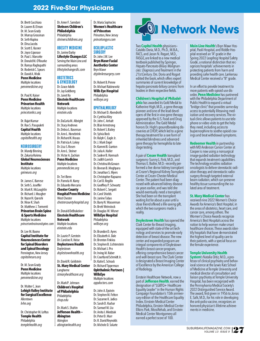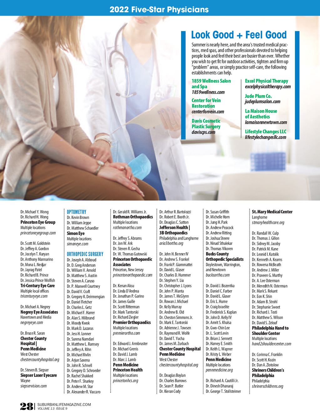 2022 Five - Star Physicians Dr . Brett Cucchiara Dr . Amer F . Samdani Dr . Maria Sophocles Dr . Lauren B . Elman Shriners Children’s Women’s Healthcare Dr . M . Sean Grady Philadelphia of Princeton Network News Dr . Murray Grossman Philadelphia Princeton , New Jersey Dr . Seth Haplea shrinerschildrens.org princetongyn.com Dr . Dina Jacobs Two Capital Health physicians — Main Line Health’s Bryn Mawr Hos - Dr . Scott E . Kasner OBESITY MEDICINE OCULOPLASTIC Cataldo Doria , M.D . , Ph.D . , M.B.A . , pital , Paoli Hospital , and Riddle Hos - Dr . Joyce Liporace Dr . Janine Darby SURGERY FACS , and Jason N . Rogart , M.D . , pital received an “ A ” grade in the Dr . Paul J . Marcotte Lifestyle Changes LLC Dr . John J.W . Lee FASGE , are linked to a new medical Spring 2022 Leapfrog Hospital Safety Dr . Donald M . O’Rourke Serving the Main Line and Bryn Mawr Facial textbook published by Springer , Grade , a national distinction that rec - Dr . Ramya Raghupathi surrounding areas Aesthetics Center Hepato - Pancreato - Biliary Malignan - ognizes hospitals ’ achievements in Dr . Roderick C . Spears lifestylechangesllc.com Bryn Mawr cies : Diagnosis and Treatment in the protecting patients from harm and Dr . David A . Wolk drjohnleesurgery.com 21st Century . Drs . Doria and Rogart providing safer health care . Lankenau Penn Medicine OBSTETRICS edited the book , which offers expert Medical Center received a “ B ” grade . Multiple locations & GYNECOLOGY Dr . Robert B . Penne summaries of current knowledge of hepato - pancreato - biliary cancers from In an effort to provide treatment to pennmedicine.org Dr . Grace Adofo Dr . Michael Rabinowitz leaders in their respective fields . more patients with opioid use dis - Dr . Jay Goldberg Wills Eye Hospital order , Penn Medicine has partnered Dr . Paul K . Kaiser Dr . Janet Ko Philadelphia Children’s Hospital of Philadel - with the Philadelphia Department of Penn Medicine Einstein Healthcare willseye.org phia has awarded its Gold Medal to Public Health to expand a virtual Princeton Health Network Katherine High , M.D . , a gene therapy “ bridge clinic ” that provides same - day Multiple locations Multiple locations OPHTHALMOLOGY pioneer and one of the lead devel - access to potentially lifesaving med - princetonhcs.org einstein.edu Dr . Michael D . Abendroth opers of the first in vivo gene therapy ication and recovery services . The vir - Dr . Cynthia Alley approved by the U.S . Food and Drug tual clinic allows patients to use tele - Dr . Rajat Kumar Dr . DaCarla M . Albright Dr . John C . Anhalt Administration . The Gold Medal phone or video visits to get the help Dr . Rao S . Pasupuleti Dr . Stacy Andrews Dr . Blair Armstrong honors Dr . High’s groundbreaking dis - they need , including access to Capital Health Dr . Debra L . Baseman Dr . Robert S . Bailey coveries at CHOP , which led to a gene buprenorphine to soothe opioid crav - Multiple locations Dr . Ann L . Honebrink Dr . Sylvia Beck therapy treatment for a rare form of ings and treat withdrawal symptoms . capitalhealth.org Dr . Richard K . Krauss Dr . Ralph C . Eagle Jr . inherited blindness and advanced Dr . Patricia A . Lokey Dr . J . Mark Engel gene therapy for hemophilia to late - Redeemer Health in partnership NEUROSURGERY Dr . Lisa S . Rosen Dr . Kammi B . Gunton stage testing . with MD Anderson Cancer Center at Dr . Mandy Binning Dr . Ann L . Steiner Dr . Julia A . Haller Cooper is now using a nonsurgical Dr . Zakaria Hakma Dr . Victor A . Zachian Dr . Sadeer B . Hannush A pair of Crozer Health transplant image - guided radiation technology Global Neurosciences Penn Medicine Dr . Judith Lavrich surgeons — Sunny L . Fink , M.D . , and that expands treatment capabilities . Thomas E . Butler , M.D . — recently per - The technology enables radiation Institute Multiple locations Dr . Christina McGowan formed a live donor kidney transplant oncologists to deliver stereotactic radi - Multiple locations pennmedicine.org Dr . Beeran B . Meghpara at Crozer’s Regional Kidney Transplant ation therapy and stereotactic radio - gnineuro.org Dr . Jonathan S . Myers Center at Crozer - Chester Medical surgery through targeted external Dr . Teri Benn Dr . Christopher Rapuano Center . The patient had been diag - beam radiation , which can preserve Dr . James C . Barrese Dr . Pamela H . Kurey Dr . Carl D . Regillo nosed with advanced kidney disease healthy tissue surrounding the iso - Dr . Seth S . Joseffer Dr . Eduardo Mercurio Dr . Geoffrey P . Schwartz six years earlier , and was told she lated area of treatment . Dr . Mark R . McLaughlin Chester County Dr . Robert C . Sergott would eventually need a transplant . Dr . Richard J . Meagher Hospital Penn Medicine Dr . Carol Shields She had been on the transplant St . Mary Medical Center has Dr . Nazer H . Qureshi West Chester Dr . Janine Tabas waiting list for about a year until a received nine 2022 Women’s Choice Dr . Nirav K . Shah chestercountyhospital.org Dr . Barry N . Wasserman close friend offered a life - saving gift , Awards for America’s Best Hospital , in Dr . Matthew J . Tormenti Dr . Brett Weinstock which the two surgeons made a the areas of obstetrics , heart care , and Princeton Brain Spine Dr . Donald DeBrakeleer Dr . Douglas W . Wisner reality . cancer care , among others . The & Sports Medicine Einstein Healthcare WillsEye Hospital Women’s Choice Awards recognize Multiple locations Network Philadelphia Doylestown Health has opened the America’s Best Hospitals across the princetonbrainandspine.com Multiple locations willseye.org Clark Center for Breast Imaging , nation to help women make smart einstein.edu equipped with state - of - the - art tech - healthcare choices . These awards iden - Dr . Lee M . Buono Dr . Brandon D . Ayres nology and services to promote early tify hospitals that have demonstrated Capital Institute for Dr . Laurie P . Gerstein Dr . Elizabeth A . Dale detection of breast disease . 