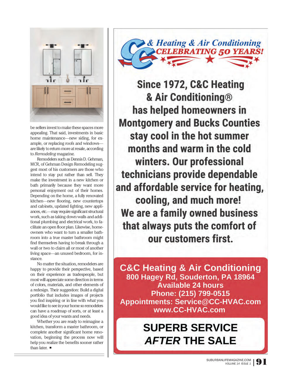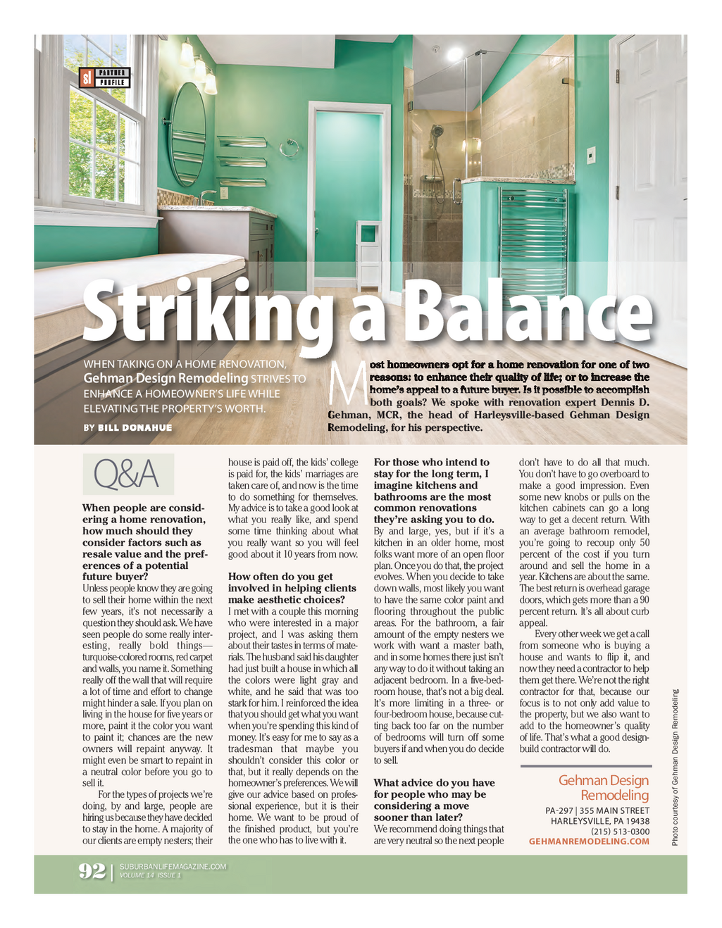 SL_PROFILE_GehmanDR_0922_Fianl_Layout 1 10 / 5 / 22 10 : 12 AM Page 2 Striking a Balance When taking on a home renovation , ost homeowners opt for a home renovation for one of two reasons : to enhance their quality of life ; or to increase the Gehman Design Remodeling strives to home’s appeal to a future buyer . Is it possible to accomplish enhance a homeoWner’s life While Mboth goals ? We spoke with renovation expert Dennis D . elevating the property’s Worth . Gehman , MCR , the head of Harleysville - based Gehman Design by B I L L D O N A H U E Remodeling , for his perspective . house is paid off , the kids ’ college For those who intend to don’t have to do all that much . is paid for , the kids ’ marriages are stay for the long term , I You don’t have to go overboard to Q & A taken care of , and now is the time imagine kitchens and make a good impression . Even to do something for themselves . bathrooms are the most some new knobs or pulls on the When people are consid - My advice is to take a good look at common renovations kitchen cabinets can go a long ering a home renovation , what you really like , and spend they’re asking you to do . way to get a decent return . With how much should they some time thinking about what By and large , yes , but if it’s a an average bathroom remodel , consider factors such as you really want so you will feel kitchen in an older home , most you’re going to recoup only 50 resale value and the pref - good about it 10 years from now . folks want more of an open floor percent of the cost if you turn erences of a potential plan . Once you do that , the project around and sell the home in a future buyer ? How often do you get evolves . When you decide to take year . Kitchens are about the same . Unless people know they are going involved in helping clients down walls , most likely you want The best return is overhead garage to sell their home within the next make aesthetic choices ? to have the same color paint and doors , which gets more than a 90 few years , it’s not necessarily a I met with a couple this morning flooring throughout the public percent return . It’s all about curb question they should ask . We have who were interested in a major areas . For the bathroom , a fair appeal . seen people do some really inter - project , and I was asking them amount of the empty nesters we Every other week we get a call esting , really bold things — about their tastes in terms of mate - work with want a master bath , from someone who is buying a turquoise - colored rooms , red carpet rials . The husband said his daughter and in some homes there just isn’t house and wants to flip it , and and walls , you name it . Something had just built a house in which all any way to do it without taking an now they need a contractor to help really off the wall that will require the colors were light gray and adjacent bedroom . In a five - bed - them get there . We’re not the right g a lot of time and effort to change white , and he said that was too room house , that’s not a big deal . contractor for that , because our elin might hinder a sale . If you plan on stark for him . I reinforced the idea It’s more limiting in a three - or focus is to not only add value to od living in the house for five years or that you should get what you want four - bedroom house , because cut - the property , but we also want to em more , paint it the color you want when you’re spending this kind of ting back too far on the number add to the homeowner’s quality R gn to paint it ; chances are the new money . It’s easy for me to say as a of bedrooms will turn off some of life . That’s what a good design - esi owners will repaint anyway . It tradesman that maybe you buyers if and when you do decide build contractor will do . D n might even be smart to repaint in shouldn’t consider this color or to sell . ma a neutral color before you go to that , but it really depends on the Geh gehman Design sell it . homeowner’s preferences . We will What advice do you have of For the types of projects we’re give our advice based on profes - for people who may be esy remodeling doing , by and large , people are sional experience , but it is their considering a move rt pa - 297 | 355 main street u hiring us because they have decided home . We want to be proud of o sooner than later ? harleysville , pa 19438 c o to stay in the home . A majority of the finished product , but you’re We recommend doing things that hot ( 215 ) 513 - 0300 our clients are empty nesters ; their the one who has to live with it . are very neutral so the next people GEHMANREMODELING.COM P SUBURBANLIFEMAGAZINE.COM VOLUME 14 ISSUE 1 92 |
