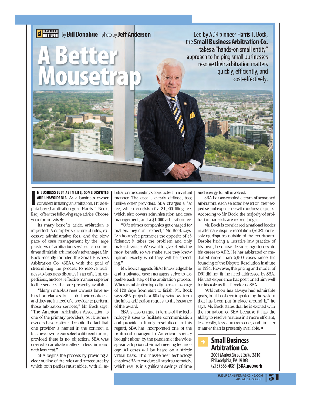 SL_Harris Bock Profile_0423final.qxp_Layout 1 4 / 28 / 23 2 : 55 PM Page 1 by Bill Donahue photo by Jeff Anderson Led by ADR pioneer Harris T . Bock , theSmall Business Arbitration Co . takes a “ hands - on small entity ” approach to helping small businesses A Better resolve their arbitration matters quickly , efficiently , and cost - effectively . Mousetrap N BUSINESS JUST AS IN LIFE , SOME DISPUTES bitrationproceedings conducted in a virtual and energy for all involved . ARE UNAVOIDABLE . As a business owner manner . The cost is clearly defined , too ; SBAhas assembled a team of seasoned Iconsiders initiating an arbitration , Philadel - unlike other providers , SBA charges a flat arbitrators , each selected based on their ex - phia - based arbitration guru Harris T . Bock , fee , which consists of a $ 1,000 filing fee , pertiseand experience with business disputes . Esq . , offers the following sage advice : Choose which also covers administration and case According to Mr . Bock , the majority of arbi - your forum wisely . management , and a $ 1,000 arbitration fee . tration panelists are retired judges . Its many benefits aside , arbitration is “ Oftentimescompanies get charged for Mr.Bock is considered a national leader imperfect . A complex structure of rules , ex - matters they don’t expect , ” Mr . Bock says . in alternate dispute resolution ( ADR ) for re - cessive administrative fees , and the slow “ An hourly fee promotes the opposite of ef - solving disputes outside of the courtroom . pace of case management by the large ficiency ; it takes the problem and only Despite having a lucrative law practice of providers of arbitration services can some - makes it worse . We want to give clients the his own , he chose decades ago to devote times diminish arbitration’s advantages . Mr . most benefit , so we make sure they know his career to ADR . He has arbitrated or me - Bock recently founded the Small Business upfront exactly what they will be spend - diated more than 5,000 cases since his Arbitration Co . ( SBA ) , with the goal of ing . ” founding of the Dispute Resolution Institute streamlining the process to resolve busi - Mr.Bock suggests SBA’s knowledgeable in 1994 . However , the pricing and model of ness - to - business disputes in an efficient , ex - and motivated case managers strive to ex - DRI did not fit the need addressed by SBA . peditious , and cost - effective manner superior pedite each step of the arbitration process . His vast experience has positioned him well to the services that are presently available . Whereas arbitration typically takes an average for his role as the Director of SBA . “ Many small - business owners have ar - of 120 days from start to finish , Mr . Bock “ Arbitration has always had admirable bitration clauses built into their contracts , says SBA projects a 60 - day window from goals , but it has been impeded by the system and they are in need of a provider to perform the initial arbitration request to the issuance that has been put in place around it , ” he those arbitration services , ” Mr . Bock says . of the award . says . Mr . Bock states that he is excited with “ The American Arbitration Association is SBA is also unique in terms of the tech - the formation of SBA because it has the one of the primary providers , but business nology it uses to facilitate communication ability to resolve matters in a more efficient , owners have options . Despite the fact that and provide a timely resolution . In this less costly , less cumbersome , and timelier ? one provider is named in the contract , a regard , SBA has incorporated one of the manner than is presently available . business owner can select a different forum , profound changes to American society provided there is no objection . SBA was brought about by the pandemic : the wide - SmallBusiness D created to arbitrate matters in less time and spreadadoption of virtual meeting technol - ArbitrationCo . with less cost . ” ogy . All cases will be heard on a strictly 2001 Market Street , Suite 3810 SBA begins the process by providing a virtual basis . This “ hassle - free ” technology Philadelphia , PA 19103 clear outline of the rules and procedures by enablesSBA to conduct all hearings remotely , ( 215 ) 656 - 4081 | SBA.network which both parties must abide , with all ar - which results in significant savings of time SUBURBANLIFEMAGAZINE.COM VOLUME 14 ISSUE 8 | 51