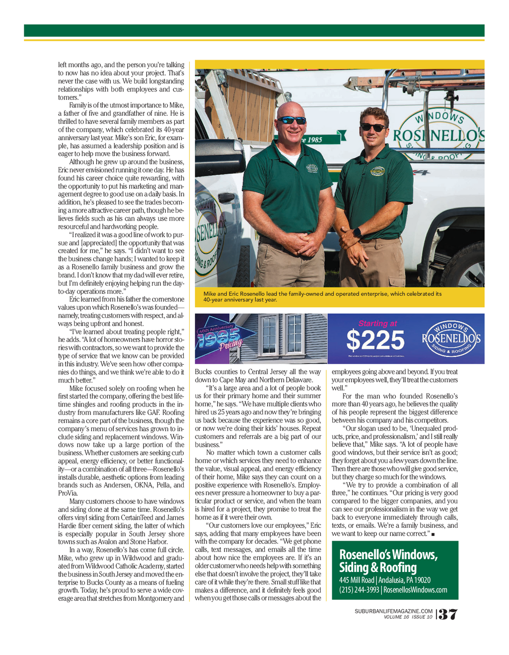 SL_Rosenellos Profile_0825 . qxp_Layout 1 9 / 26 / 25 11 : 23 AM Page 2 left months ago , and the person you’re talking to now has no idea about your project . That’s never the case with us . We build longstanding relationships with both employees and cus - tomers . ” Family is of the utmost importance to Mike , a father of five and grandfather of nine . He is thrilled to have several family members as part of the company , which celebrated its 40 - year anniversary last year . Mike’s son Eric , for exam - ple , has assumed a leadership position and is eager to help move the business forward . Although he grew up around the business , Eric never envisioned running it one day . He has found his career choice quite rewarding , with the opportunity to put his marketing and man - agement degree to good use on a daily basis . In addition , he’s pleased to see the trades becom - ing a more attractive career path , though he be - lieves fields such as his can always use more resourceful and hardworking people . “ I realized it was a good line of work to pur - sue and [ appreciated ] the opportunity that was created for me , ” he says . “ I didn’t want to see the business change hands ; I wanted to keep it as a Rosenello family business and grow the brand . I don’t know that my dad will ever retire , but I’m definitely enjoying helping run the day - to - day operations more . ” Mike and Eric Rosenello lead the family - owned and operated enterprise , which celebrated its Eric learned from his father the cornerstone 40 - year anniversary last year . values upon which Rosenello’s was founded — namely , treating customers with respect , and al - ways being upfront and honest . “ I’ve learned about treating people right , ” he adds . “ A lot of homeowners have horror sto - ries with contractors , so we want to provide the type of service that we know can be provided in this industry . We’ve seen how other compa - Bucks counties to Central Jersey all the way employeesgoing above and beyond . If you treat nies do things , and we think we’re able to do it down to Cape May and Northern Delaware . youremployees well , they’ll treat the customers much better . ” “ It’s a large area and a lot of people book well . ” Mike focused solely on roofing when he us for their primary home and their summer For the man who founded Rosenello’s first started the company , offering the best life - home , ” he says . “ We have multiple clients who more than 40 years ago , he believes the quality time shingles and roofing products in the in - hired us 25 years ago and now they’re bringing of his people represent the biggest difference dustry from manufacturers like GAF . Roofing us back because the experience was so good , between his company and his competitors . remains a core part of the business , though the or now we’re doing their kids ’ houses . Repeat “ Our slogan used to be , ‘ Unequaled prod - company’s menu of services has grown to in - customers and referrals are a big part of our ucts , price , and professionalism , ’ and I still really clude siding and replacement windows . Win - business . ” believe that , ” Mike says . “ A lot of people have dows now take up a large portion of the No matter which town a customer calls good windows , but their service isn’t as good ; business.Whether customers are seeking curb home or which services they need to enhance theyforget about you a few years down the line . appeal , energy efficiency , or better functional - the value , visual appeal , and energy efficiency Thenthere are those who will give good service , ity — ora combination of all three — Rosenello’s of their home , Mike says they can count on a but they charge so much for the windows . installs durable , aesthetic options from leading positive experience with Rosenello’s . Employ - “ We try to provide a combination of all brands such as Andersen , OKNA , Pella , and ees never pressure a homeowner to buy a par - three , ” he continues . “ Our pricing is very good ProVia . ticular product or service , and when the team compared to the bigger companies , and you Many customers choose to have windows is hired for a project , they promise to treat the can see our professionalism in the way we get and siding done at the same time . Rosenello’s home as if it were their own . back to everyone immediately through calls , offers vinyl siding from CertainTeed and James “ Our customers love our employees , ” Eric texts , or emails . We’re a family business , and Hardie fiber cement siding , the latter of which says , adding that many employees have been we want to keep our name correct . ” ? is especially popular in South Jersey shore with the company for decades . “ We get phone towns such as Avalon and Stone Harbor . calls , text messages , and emails all the time In a way , Rosenello’s has come full circle . Rosenello’s Windows , about how nice the employees are . If it’s an Mike , who grew up in Wildwood and gradu - older customer who needs help with something atedfrom Wildwood Catholic Academy , started Siding & Roofing else that doesn’t involve the project , they’ll take thebusiness in South Jersey and moved the en - 445 Mill Road | Andalusia , PA 19020 careof it while they’re there . Small stuff like that terprise to Bucks County as a means of fueling makes a difference , and it definitely feels good ( 215 ) 244 - 3993 | RosenellosWindows.com growth . Today , he’s proud to serve a wide cov - when you get those calls or messages about the eragearea that stretches from Montgomery and SUBURBANLIFEMAGAZINE.COM VOLUME 16 ISSUE 10 | 37