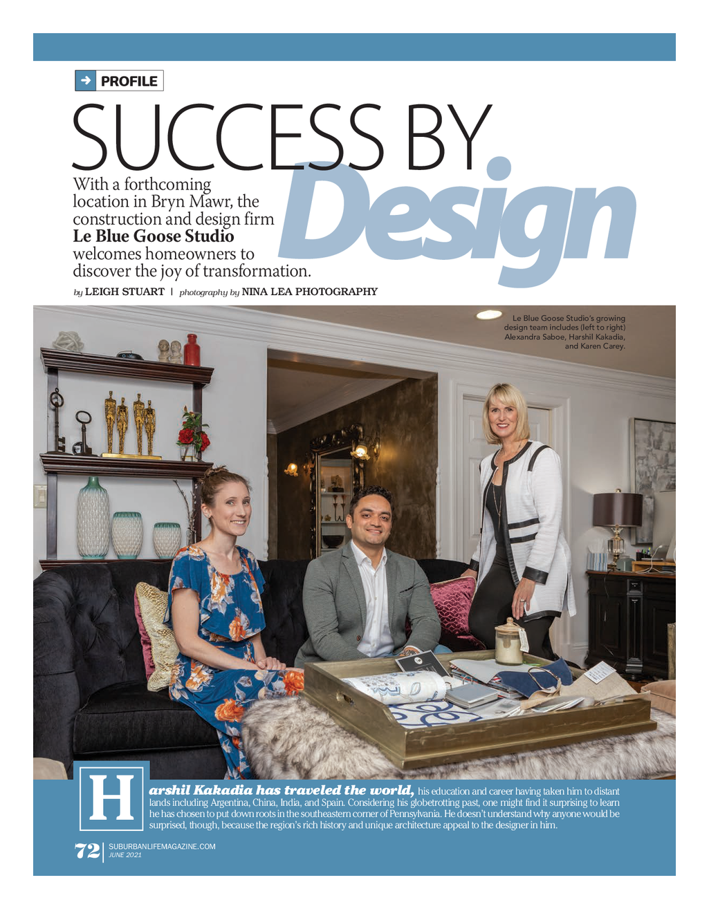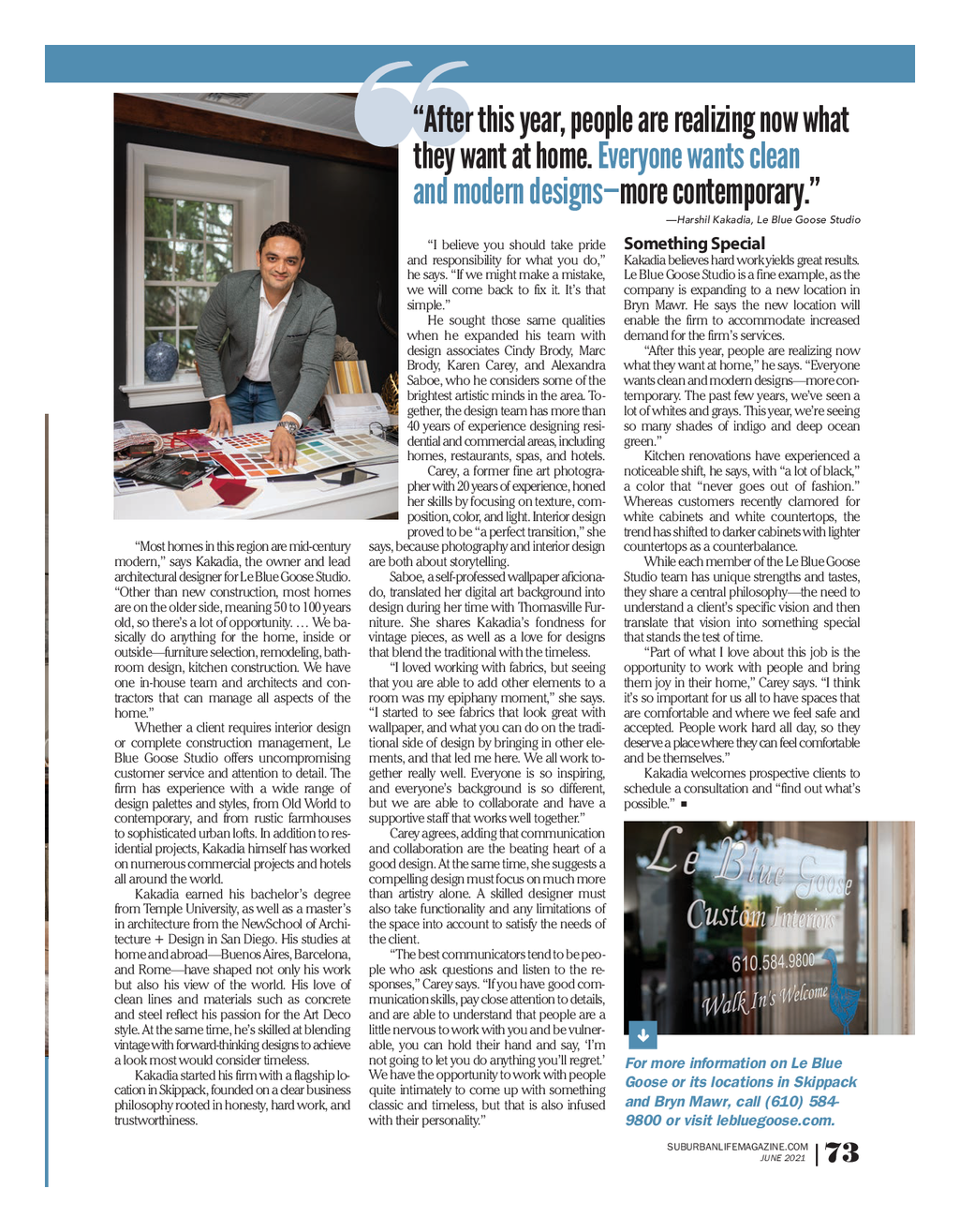 SL_LeBlueGoose_Profile_6_21_Profile 6 / 28 / 21 5 : 30 PM Page 2 “ After this year , people are realizing now what they want at home . Everyone wants clean and modern designs — more contemporary . ” — Harshil Kakadia , Le Blue Goose Studio “ I believe you should take pride Something Special and responsibility for what you do , ” Kakadia believes hard work yields great results . he says . “ If we might make a mistake , Le Blue Goose Studio is a fine example , as the we will come back to fix it . It’s that company is expanding to a new location in simple . ” Bryn Mawr . He says the new location will He sought those same qualities enable the firm to accommodate increased when he expanded his team with demand for the firm’s services . design associates Cindy Brody , Marc “ After this year , people are realizing now Brody , Karen Carey , and Alexandra what they want at home , ” he says . “ Everyone Saboe , who he considers some of the wants clean and modern designs — more con - brightest artistic minds in the area . To - temporary . The past few years , we’ve seen a gether , the design team has more than lot of whites and grays . This year , we’re seeing 40 years of experience designing resi - so many shades of indigo and deep ocean dential and commercial areas , including green . ” homes , restaurants , spas , and hotels . Kitchen renovations have experienced a Carey , a former fine art photogra - noticeable shift , he says , with “ a lot of black , ” pher with 20 years of experience , honed a color that “ never goes out of fashion . ” her skills by focusing on texture , com - Whereas customers recently clamored for position , color , and light . Interior design white cabinets and white countertops , the proved to be “ a perfect transition , ” she trend has shifted to darker cabinets with lighter says , because photography and interior design countertops as a counterbalance . “ Most homes in this region are mid - century are both about storytelling . While each member of the Le Blue Goose modern , ” says Kakadia , the owner and lead Saboe , a self - professed wallpaper aficiona - Studio team has unique strengths and tastes , architectural designer for Le Blue Goose Studio . do , translated her digital art background into they share a central philosophy — the need to “ Other than new construction , most homes design during her time with Thomasville Fur - understand a client’s specific vision and then are on the older side , meaning 50 to 100 years niture . She shares Kakadia’s fondness for translate that vision into something special old , so there’s a lot of opportunity . … We ba - vintage pieces , as well as a love for designs that stands the test of time . sically do anything for the home , inside or that blend the traditional with the timeless . “ Part of what I love about this job is the outside — furniture selection , remodeling , bath - “ I loved working with fabrics , but seeing opportunity to work with people and bring room design , kitchen construction . We have that you are able to add other elements to a them joy in their home , ” Carey says . “ I think one in - house team and architects and con - room was my epiphany moment , ” she says . it’s so important for us all to have spaces that tractors that can manage all aspects of the “ I started to see fabrics that look great with are comfortable and where we feel safe and home . ” wallpaper , and what you can do on the tradi - accepted . People work hard all day , so they Whether a client requires interior design tional side of design by bringing in other ele - deservea place where they can feel comfortable or complete construction management , Le ments , and that led me here . We all work to - and be themselves . ” Blue Goose Studio offers uncompromising gether really well . Everyone is so inspiring , Kakadia welcomes prospective clients to customer service and attention to detail . The and everyone’s background is so different , schedule a consultation and “ find out what’s firm has experience with a wide range of ? but we are able to collaborate and have a possible . ” design palettes and styles , from Old World to supportive staff that works well together . ” contemporary , and from rustic farmhouses Carey agrees , adding that communication to sophisticated urban lofts . In addition to res - and collaboration are the beating heart of a idential projects , Kakadia himself has worked good design . At the same time , she suggests a on numerous commercial projects and hotels compelling design must focus on much more all around the world . than artistry alone . A skilled designer must Kakadia earned his bachelor’s degree also take functionality and any limitations of from Temple University , as well as a master’s the space into account to satisfy the needs of in architecture from the NewSchool of Archi - the client . tecture + Design in San Diego . His studies at “ The best communicators tend to be peo - home and abroad — Buenos Aires , Barcelona , ple who ask questions and listen to the re - and Rome — have shaped not only his work sponses , ” Carey says . “ If you have good com - but also his view of the world . His love of munication skills , pay close attention to details , clean lines and materials such as concrete and are able to understand that people are a and steel reflect his passion for the Art Deco D little nervous to work with you and be vulner - style . At the same time , he’s skilled at blending able , you can hold their hand and say , ‘ I’m vintagewith forward - thinking designs to achieve not going to let you do anything you’ll regret . ’ a look most would consider timeless . For more information on Le Blue We have the opportunity to work with people Kakadia started his firm with a flagship lo - Goose or its locations in Skippack quite intimately to come up with something cation in Skippack , founded on