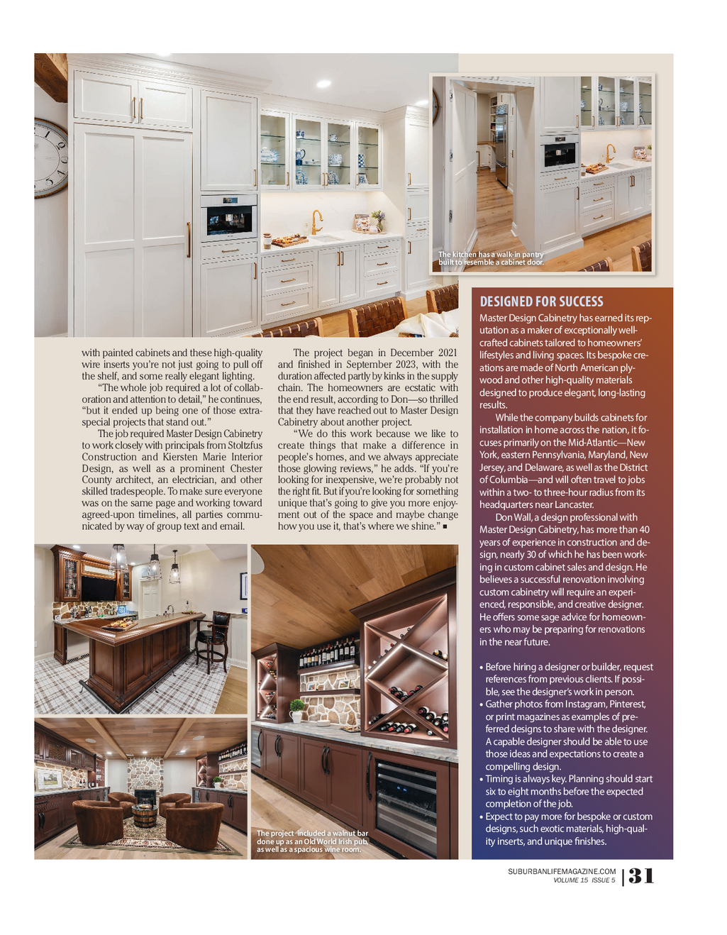 SL_PROFILE_Master Design Cabinetry_0124_Layout 1 1 / 31 / 24 2 : 06 PM Page 2 The kitchen has a walk - in pantry built to resemble a cabinet door . DESIGNED FOR SUCCESS Master Design Cabinetry has earned its rep - utation as a maker of exceptionally well - crafted cabinets tailored to homeowners ’ withpainted cabinets and these high - quality The project began in December 2021 lifestyles and living spaces . Its bespoke cre - wire inserts you’re not just going to pull off and finished in September 2023 , with the ations are made of North American ply - the shelf , and some really elegant lighting . durationaffected partly by kinks in the supply wood and other high - quality materials “ The whole job required a lot of collab - chain . The homeowners are ecstatic with designed to produce elegant , long - lasting orationand attention to detail , ” he continues , theend result , according to Don — so thrilled results . “ but it ended up being one of those extra - that they have reached out to Master Design While the company builds cabinets for special projects that stand out . ” Cabinetry about another project . installation in home across the nation , it fo - Thejob required Master Design Cabinetry “ We do this work because we like to cuses primarily on the Mid - Atlantic — New towork closely with principals from Stoltzfus create things that make a difference in York , eastern Pennsylvania , Maryland , New Construction and Kiersten Marie Interior people’s homes , and we always appreciate Jersey , and Delaware , as well as the District Design , as well as a prominent Chester those glowing reviews , ” he adds . “ If you’re of Columbia — and will often travel to jobs County architect , an electrician , and other looking for inexpensive , we’re probably not skilled tradespeople . To make sure everyone theright fit . But if you’re looking for something within a two - to three - hour radius from its was on the same page and working toward unique that’s going to give you more enjoy - headquarters near Lancaster . agreed - upon timelines , all parties commu - ment out of the space and maybe change Don Wall , a design professional with ? nicated by way of group text and email . how you use it , that’s where we shine . ” Master Design Cabinetry , has more than 40 years of experience in construction and de - sign , nearly 30 of which he has been work - ing in custom cabinet sales and design . He believes a successful renovation involving custom cabinetry will require an experi - enced , responsible , and creative designer . He o?ers some sage advice for homeown - ers who may be preparing for renovations in the near future . • Before hiring a designer or builder , request references from previous clients . If possi - ble , see the designer’s work in person . • Gather photos from Instagram , Pinterest , or print magazines as examples of pre - ferred designs to share with the designer . A capable designer should be able to use those ideas and expectations to create a compelling design . • Timing is always key . Planning should start six to eight months before the expected completion of the job . • Expect to pay more for bespoke or custom designs , such exotic materials , high - qual - The project included a walnut bar done up as an Old World Irish pub , ity inserts , and unique finishes . as well as a spacious wine room . SUBURBANLIFEMAGAZINE.COM VOLUME 15 ISSUE 5 | 31