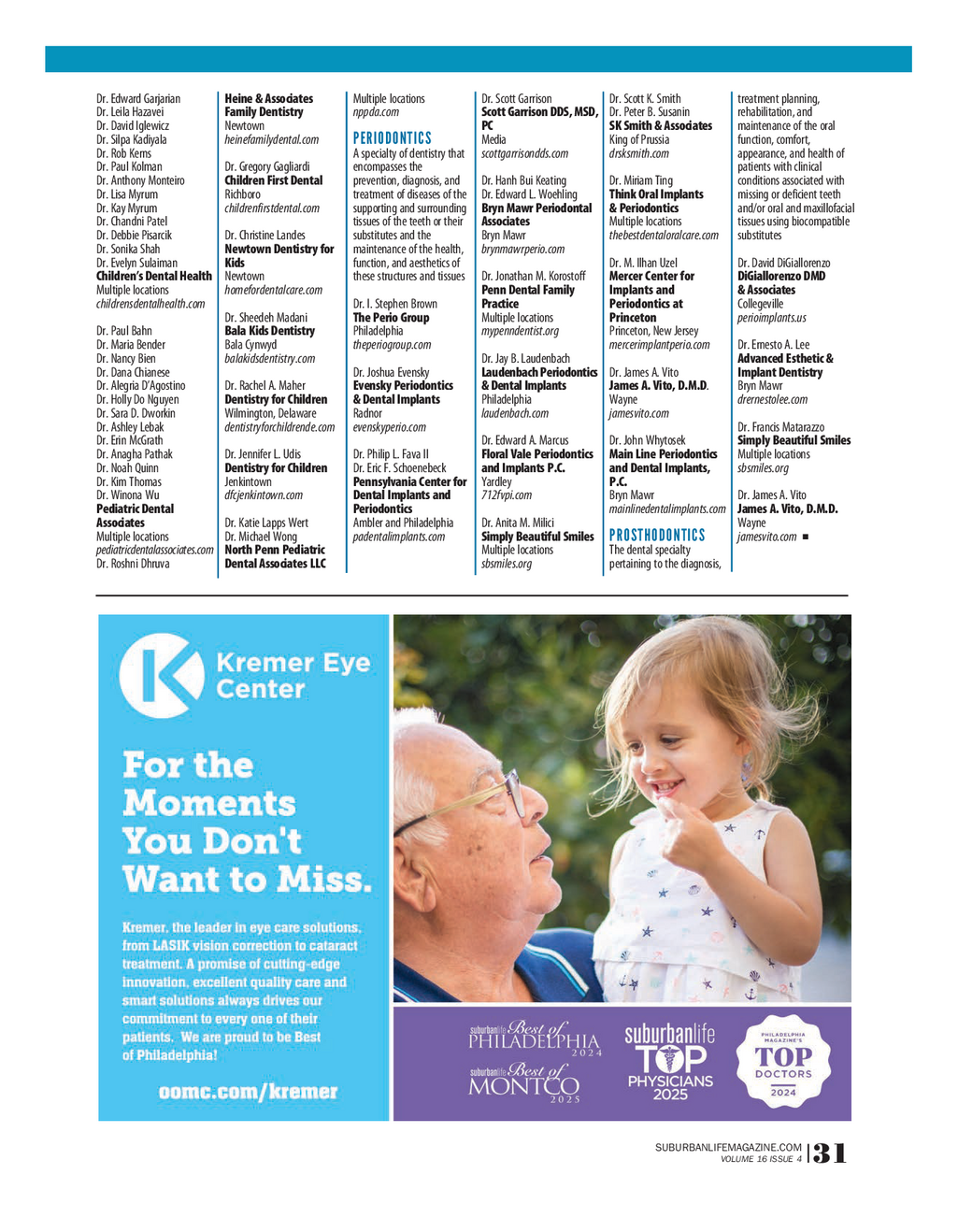 SL_Top Dentists_0225FINAL.qxp_Layout 1 3 / 4 / 25 3 : 44 PM Page 4 Dr . Edward Garjarian Heine & Associates Multiple locations Dr . Scott Garrison Dr . Scott K . Smith treatment planning , Dr . Leila Hazavei Family Dentistry nppda.com Scott Garrison DDS , MSD , Dr . Peter B . Susanin rehabilitation , and Dr . David Iglewicz Newtown PC SK Smith & Associates maintenance of the oral Dr . Silpa Kadiyala heinefamilydental.com PERIODONTICS Media King of Prussia function , comfort , Dr . Rob Kerns A specialty of dentistry that scottgarrisondds.com drsksmith.com appearance , and health of Dr . Paul Kolman Dr . Gregory Gagliardi encompasses the patients with clinical Dr . Anthony Monteiro Children First Dental prevention , diagnosis , and Dr . Hanh Bui Keating Dr . Miriam Ting conditions associated with Dr . Lisa Myrum Richboro treatment of diseases of the Dr . Edward L . Woehling Think Oral Implants missing or deficient teeth Dr . Kay Myrum childrenfirstdental.com supporting and surrounding Bryn Mawr Periodontal & Periodontics and / or oral and maxillofacial Dr . Chandni Patel tissues of the teeth or their Associates Multiple locations tissues using biocompatible Dr . Debbie Pisarcik Dr . Christine Landes substitutes and the Bryn Mawr thebestdentaloralcare.com substitutes Dr . Sonika Shah Newtown Dentistry for maintenance of the health , brynmawrperio.com Dr . Evelyn Sulaiman Kids function , and aesthetics of Dr . M . Ilhan Uzel Dr . David DiGiallorenzo Children’s Dental Health Newtown these structures and tissues Dr . Jonathan M . Korostoff Mercer Center for DiGiallorenzo DMD Multiple locations homefordentalcare.com Penn Dental Family Implants and & Associates childrensdentalhealth.com Dr . I . Stephen Brown Practice Periodontics at Collegeville Dr . Sheedeh Madani The Perio Group Multiple locations Princeton perioimplants.us Dr . Paul Bahn Bala Kids Dentistry Philadelphia mypenndentist.org Princeton , New Jersey Dr . Maria Bender Bala Cynwyd theperiogroup.com mercerimplantperio.com Dr . Ernesto A . Lee Dr . Nancy Bien balakidsdentistry.com Dr . Jay B . Laudenbach Advanced Esthetic & Dr . Dana Chianese Dr . Joshua Evensky Laudenbach Periodontics Dr . James A . Vito Implant Dentistry Dr . Alegria D’Agostino Dr . Rachel A . Maher Evensky Periodontics & Dental Implants James A . Vito , D.M.D . Bryn Mawr Dr . Holly Do Nguyen Dentistry for Children & Dental Implants Philadelphia Wayne drernestolee.com Dr . Sara D . Dworkin Wilmington , Delaware Radnor laudenbach.com jamesvito.com Dr . Ashley Lebak dentistryforchildrende.com evenskyperio.com Dr . Francis Matarazzo Dr . Erin McGrath Dr . Edward A . Marcus Dr . John Whytosek Simply Beautiful Smiles Dr . Anagha Pathak Dr . Jennifer L . Udis Dr . Philip L . Fava II Floral Vale Periodontics Main Line Periodontics Multiple locations Dr . Noah Quinn Dentistry for Children Dr . Eric F . Schoenebeck and Implants P.C . and Dental Implants , sbsmiles.org Dr . Kim Thomas Jenkintown Pennsylvania Center for Yardley P.C . Dr . Winona Wu dfcjenkintown.com Dental Implants and 712fvpi.com Bryn Mawr Dr . James A . Vito Pediatric Dental Periodontics mainlinedentalimplants.com James A . Vito , D.M.D . Associates Dr . Katie Lapps Wert Ambler and Philadelphia Dr . Anita M . Milici Wayne ? Multiple locations Dr . Michael Wong padentalimplants.com Simply Beautiful Smiles PROSTHODONTICS jamesvito.com pediatricdentalassociates.com North Penn Pediatric Multiple locations The dental specialty Dr . Roshni Dhruva Dental Associates LLC sbsmiles.org pertaining to the diagnosis , SUBURBANLIFEMAGAZINE.COM VOLUME 16 ISSUE 4 | 31