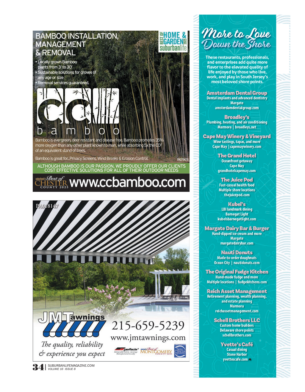 SL_BestOfTheShore_0625 - FINAL_SJM Feature 7 / 16 / 25 3 : 00 PM Page 11 More to Love Down the Shore These restaurants , professionals , and enterprises add quite more flavor to the elevated quality of life enjoyed by those who live , work , and play in South Jersey’s most beloved shore points . Amsterdam Dental Group Dental implants and advanced dentistry Margate amsterdamdentalgroup.com Broadley’s Plumbing , heating , and air conditioning Marmora | broadleys.net Cape May Winery & Vineyard Wine tastings , tapas , and more Cape May | capemaywinery.com The Grand Hotel Oceanfront getaway Cape May grandhotelcapemay.com The Juice Pod Fast - casual health food Multiple shore locations thejuicepod.com Kubel’s LBI landmark dining Barnegat Light kubelsbarnegatlight.com Margate Dairy Bar & Burger Hand - dipped ice cream and more Margate margatedairybar.com Nauti Donuts Made - to - order doughnuts Ocean City | nautidonuts.com The Original Fudge Kitchen Hand - made fudge and more Multiple locations | fudgekitchens.com Reich Asset Management Retirement planning , wealth planning , and estate planning Marmora reichassetmanagement.com Schell Brothers LLC Custom home builders Delaware shore points schellbrothers.com Yvette’s Café Casual dining Stone Harbor ? yvettescafe.com SUBURBANLIFEMAGAZINE.COM VOLUME 16 ISSUE 8 34 |