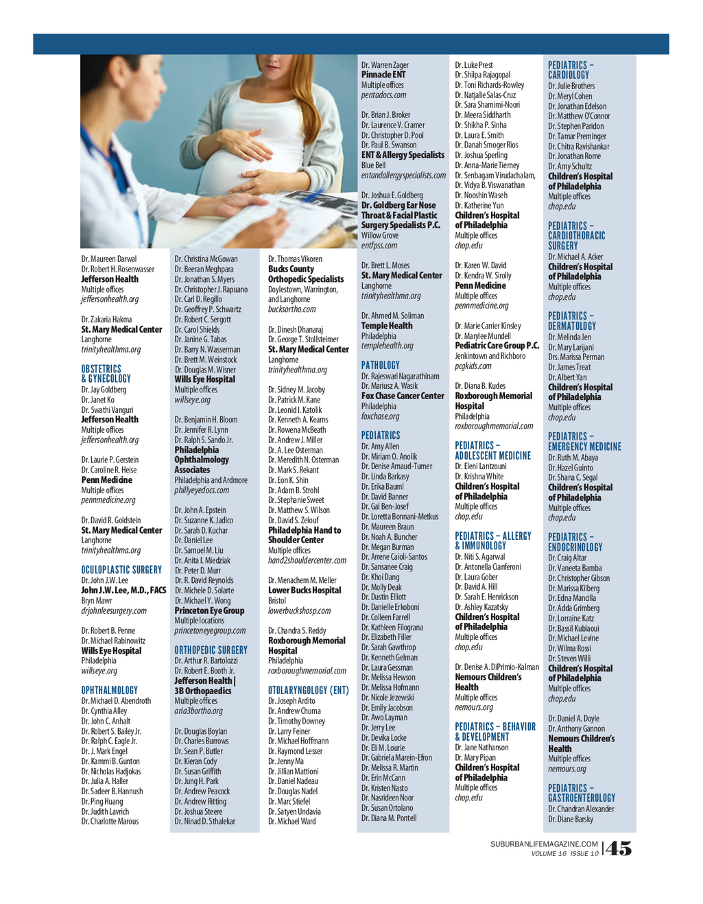 SL_Top Physicians_0825FINAL.qxp_Layout 1 9 / 26 / 25 10 : 50 AM Page 3 Dr . Warren Zager Dr.Luke Prest PEDIATRICS – Pinnacle ENT Shilpa Rajagopal Dr . CARDIOLOGY Multipleoffices Dr.Toni Richards - Rowley Dr.Julie Brothers pentadocs.com Dr.NatjalieSalas - Cruz Dr.Meryl Cohen Dr.Sara Shamimi - Noori Dr.Jonathan Edelson Dr.Brian J . Broker Dr.Meera Siddharth Dr.Matthew O’Connor Dr.Laurence V . Cramer Dr.Shikha P . Sinha Dr.Stephen Paridon Dr.Christopher D . Pool Dr.Laura E . Smith Dr.Tamar Preminger Dr.Paul B . Swanson Dr.Danah Smoger Rios Dr.Chitra Ravishankar ENT & Allergy Specialists Dr.Joshua Sperling Dr.Jonathan Rome BlueBell Dr.Anna - Marie Tierney Dr.Amy Schultz entandallergyspecialists.com Dr.SenbagamVirudachalam , Children’sHospital Dr . Vidya B . Viswanathan ofPhiladelphia Dr.Joshua E . Goldberg Dr.Nooshin Waseh Multipleoffices Dr.Goldberg Ear Nose Dr.Katherine Yun chop.edu Throat & Facial Plastic Children’s Hospital Surgery Specialists P.C . of Philadelphia PEDIATRICS – Willow Grove Multiple offices CARDIOTHORACIC entfpss.com chop.edu SURGERY Dr . Michael A . Acker Dr.Maureen Darwal Dr.Christina McGowan Dr.Thomas Vikoren Dr.Brett L . Moses Dr . Karen W . David Children’sHospital Dr . Robert H . Rosenwasser Dr.Beeran Meghpara BucksCounty St . Mary Medical Center Dr.Kendra W . Sirolly ofPhiladelphia JeffersonHealth Dr.Jonathan S . Myers OrthopedicSpecialists Langhorne PennMedicine Multipleoffices Multipleoffices Dr.Christopher J . Rapuano Doylestown , Warrington , trinityhealthma.org Multiple offices chop.edu jeffersonhealth.org Dr.CarlD.Regillo andLanghorne pennmedicine.org Dr.Geoffrey P . Schwartz bucksortho.com Dr.AhmedM . Soliman PEDIATRICS – Dr . Zakaria Hakma Dr.Robert C . Sergott TempleHealth Dr . Marie Carrier Kinsley DERMATOLOGY St.MaryMedical Center Dr.Carol Shields Dr.Dinesh Dhanaraj Philadelphia Dr.MaryleeMundell Dr.Melinda Jen Langhorne Dr.JanineG . Tabas Dr.George T . Stollsteimer templehealth.org PediatricCare Group P.C . Dr.Mary Larijani trinityhealthma.org Dr.BarryN . Wasserman St.Mary Medical Center Jenkintownand Richboro Drs.Marissa Perman Dr.Brett M . Weinstock Langhorne PATHOLOGY pcgkids.com Dr.JamesTreat OBSTETRICS Dr.DouglasM . Wisner trinityhealthma.org Dr.RajeswariNagarathinam Dr.Albert Yan & GYNECOLOGY Wills Eye Hospital Dr . Mariusz A . Wasik Dr.Diana B . Kudes Children’sHospital Dr . Jay Goldberg Multiple offices Dr . Sidney M . Jacoby FoxChase Cancer Center Roxborough Memorial ofPhiladelphia Dr.Janet Ko willseye.org Dr.Patrick M . Kane Philadelphia Hospital Multipleoffices Dr.SwathiVanguri Dr . Leonid I . Katolik foxchase.org Philadelphia chop.edu JeffersonHealth Dr.Benjamin H . Bloom Dr.Kenneth A . Kearns roxboroughmemorial.com Multipleoffices Dr.Jennifer R . Lynn Dr.Rowena McBeath PEDIATRICS PEDIATRICS – jeffersonhealth.org Dr.Ralph S . Sando Jr . Dr.Andrew J . Miller Dr.Amy Allen PEDIATRICS – EMERGENCY MEDICINE Philadelphia Dr.A . Lee Osterman Dr.Miriam O . Anolik ADOLESCENT MEDICINE Dr.Ruth M . Abaya Dr.Laurie P . Gerstein Ophthalmology Dr . Meredith N . Osterman Dr.Denise Arnaud - Turner Dr.Eleni Lantzouni Dr.Hazel Guinto Dr.Caroline R . Heise Associates Dr.Mark S . Rekant Dr.Linda Barkasy Dr.Krishna White Dr.Shana C . Segal PennMedicine Philadelphia and Ardmore Dr.Eon K . Shin Dr.Erika Bauml Children’sHospital Children’s Hospital Multiple offices phillyeyedocs.com Dr.Adam B . Strohl Dr.David Banner ofPhiladelphia ofPhiladelphia pennmedicine.org Dr.StephanieSweet Dr.Gal Ben - Josef Multipleoffices Multipleoffices Dr.John A . Epstein Dr.Matthew S . Wilson Dr.Loretta Bonnani - Metkus chop.edu chop.edu Dr.DavidR.Goldstein Dr.Suzanne K . Jadico Dr.David S . Zelouf Dr.Maureen Braun St.Mary Medical Center Dr.Sarah D . Kuchar PhiladelphiaHand to Dr.Noah A . Buncher PEDIATRICS – ALLERGY PEDIATRICS – Langhorne Dr.Daniel Lee ShoulderCenter Dr.Megan Burman & IMMUNOLOGY ENDOCRINOLOGY trinityhealthma.org Dr.SamuelM.Liu Multipleoffices Dr.Arrene Caioli - Santos Dr . Niti S . Agarwal Dr.Craig Altar Dr.Anita I . Miedziak hand2shouldercenter.com Dr.SansaneeCraig Dr.Antonella Cianferoni Dr.Vaneeta Bamba OCULOPLASTIC SURGERY Dr.Peter D . Murr Dr.Khoi Dang Dr.Laura Gober Dr.Christopher Gibson Dr.John J.W . Lee Dr.R . David Reynolds Dr.Menachem M . Meller Dr.Molly Deak Dr.David A . Hill Dr.Marissa Kilberg JohnJ.W . Lee , M.D . , FACS Dr.Michele D . Solarte LowerBucks Hospital Dr.Dustin Elliott Dr.Sarah E . Henrickson Dr.Edna Mancilla BrynMawr Dr.Michael Y . Wong Bristol Dr.DanielleErkoboni Dr.Ashley Kazatsky Dr.Adda Grimberg drjohnleesurgery.com PrincetonEye Group lowerbuckshosp.com Dr.Colleen Farrell Children’sHospital Dr . Lorraine Katz Multiplelocations Dr.Kathleen Filograna ofPhiladelphia Dr.Bassil Kublaoui Dr.Robert B . Penne princetoneyegroup.com Dr . Chandra S . Reddy Dr.Elizabeth Filler Multipleoffices Dr.Michael Levine Dr.Michael Rabinowitz RoxboroughMemorial Dr.Sarah Gawthrop chop.edu Dr.WilmaRossi WillsEye Hospital ORTHOPEDIC SURGERY Hospital Dr.Kenneth Gelman Dr.Steven Willi Philadelphia Dr.Arthur R . Bartolozzi Philadelphia Dr.Laura Gessman Dr.Denise A . DiPrimio - Kalman Children’sHospital willseye.org Dr.Robert E . Booth Jr . roxboroughmemorial.com Dr.MelissaHewson NemoursChildren’s ofPhiladelphia JeffersonHealth | Dr . Melissa Hofmann Health Multipleoffices OPHTHALMOLOGY 3BOrthopaedics OTOLARYNGOLOGY ( ENT ) Dr.Nicole Jezewski Multipleoffices chop.edu Dr.MichaelD . Abendroth Multiple offices Dr . Joseph Ardito Dr.Emily Jacobson nemours.org Dr.CynthiaAlley aria3bortho.org Dr.Andrew Chuma Dr.Awo Layman Dr.Daniel A . Doyle Dr.John C . Anhalt Dr . Timothy Downey Dr.Jerry Lee PEDIATRICS – BEHAVIOR Dr.Anthony Gannon Dr.Robert S . Bailey Jr . Dr.Douglas Boylan Dr.Larry Feiner Dr.Devika Locke & DEVELOPMENT NemoursChildren’s Dr.Ralph C . Eagle Jr . Dr.Charles Burrows Dr.Michael Hoffmann Dr . Eli M . Lourie Dr.Jane Nathanson Health Dr . J . Mark Engel Dr.Sean P . Butler Dr.Raymond Lesser Dr.Gabriela Marein - Efron Dr.Mary Pip