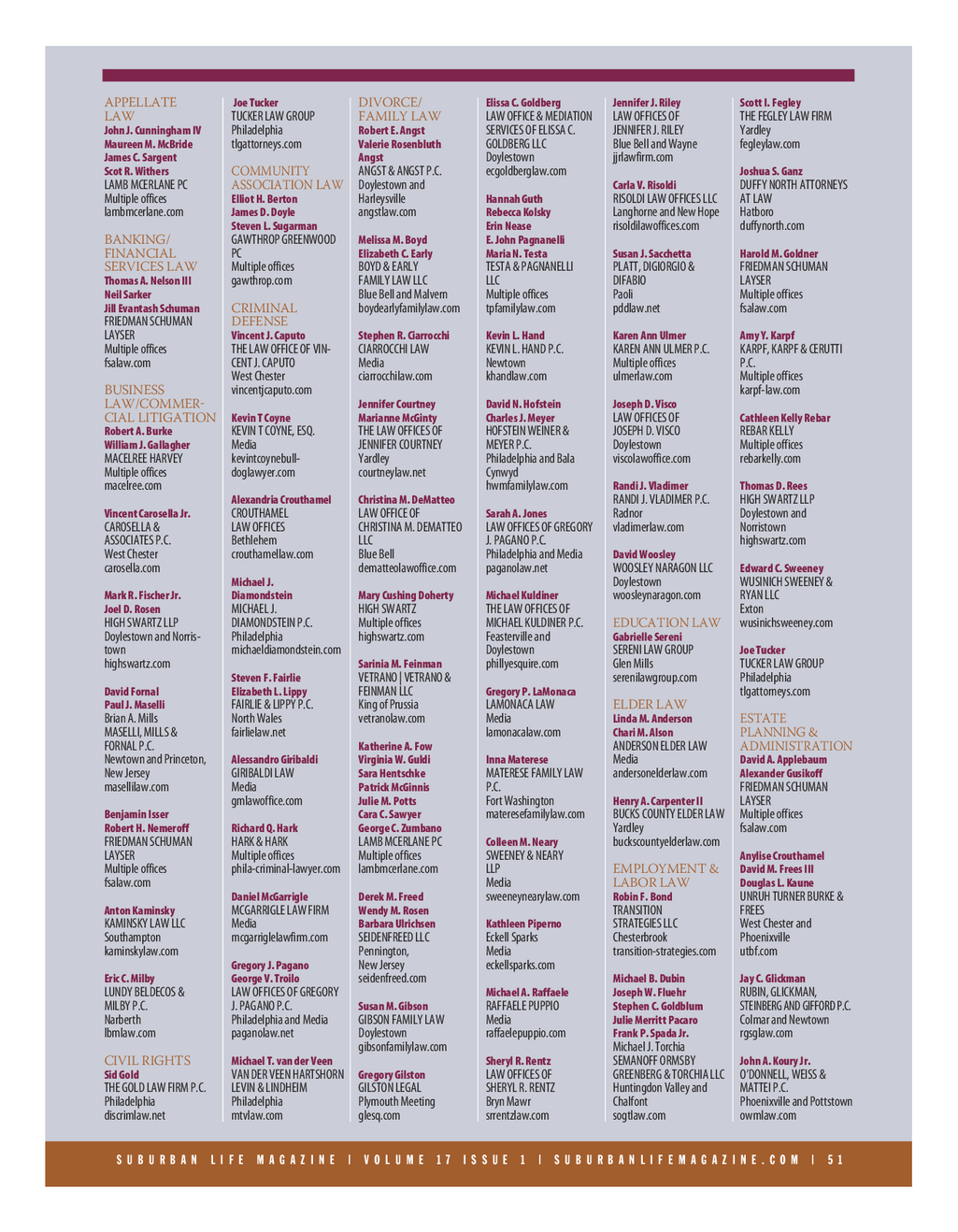SL_Attorneys_1125 - FINAL_SJM Feature 12 / 23 / 25 11 : 14 AM Page 2 APPELLATE Joe Tucker DIVORCE / Elissa C . Goldberg Jennifer J . Riley Scott I . Fegley LAW TUCKER LAW GROUP FAMILY LAW LAW OFFICE & MEDIATION LAW OFFICES OF THE FEGLEY LAW FIRM John J . Cunningham IV Philadelphia Robert E . Angst SERVICES OF ELISSA C . JENNIFER J . RILEY Yardley Maureen M . McBride tlgattorneys.com Valerie Rosenbluth GOLDBERG LLC Blue Bell and Wayne fegleylaw.com James C . Sargent Angst Doylestown jjrlawfirm.com Scot R . Withers COMMUNITY ANGST & ANGST P.C . ecgoldberglaw.com Joshua S . Ganz LAMB MCERLANE PC ASSOCIATION LAW Doylestown and Carla V . Risoldi DUFFY NORTH ATTORNEYS Multiple offices Elliot H . Berton Harleysville Hannah Guth RISOLDI LAW OFFICES LLC AT LAW lambmcerlane.com James D . Doyle angstlaw.com Rebecca Kolsky Langhorne and New Hope Hatboro Steven L . Sugarman Erin Nease risoldilawoffices.com duffynorth.com BANKING / GAWTHROP GREENWOOD Melissa M . Boyd E . John Pagnanelli FINANCIAL PC Elizabeth C . Early Maria N . Testa Susan J . Sacchetta Harold M . Goldner SERVICES LAW Multiple offices BOYD & EARLY TESTA & PAGNANELLI PLATT , DIGIORGIO & FRIEDMAN SCHUMAN Thomas A . Nelson III gawthrop.com FAMILY LAW LLC LLC DIFABIO LAYSER Neil Sarker Blue Bell and Malvern Multiple offices Paoli Multiple offices Jill Evantash Schuman CRIMINAL boydearlyfamilylaw.com tpfamilylaw.com pddlaw.net fsalaw.com FRIEDMAN SCHUMAN DEFENSE LAYSER Vincent J . Caputo Stephen R . Ciarrocchi Kevin L . Hand Karen Ann Ulmer Amy Y . Karpf Multiple offices THE LAW OFFICE OF VIN - CIARROCCHI LAW KEVIN L . HAND P.C . KAREN ANN ULMER P.C . KARPF , KARPF & CERUTTI fsalaw.com CENT J . CAPUTO Media Newtown Multiple offices P.C . West Chester ciarrocchilaw.com khandlaw.com ulmerlaw.com Multiple offices BUSINESS vincentjcaputo.com karpf - law.com LAW / COMMER - Jennifer Courtney David N . Hofstein Joseph D . Visco CIAL LITIGATION Kevin T Coyne Marianne McGinty Charles J . Meyer LAW OFFICES OF Cathleen Kelly Rebar Robert A . Burke KEVIN T COYNE , ESQ . THE LAW OFFICES OF HOFSTEIN WEINER & JOSEPH D . VISCO REBAR KELLY William J . Gallagher Media JENNIFER COURTNEY MEYER P.C . Doylestown Multiple offices MACELREE HARVEY kevintcoynebull - Yardley Philadelphia and Bala viscolawoffice.com rebarkelly.com Multiple offices doglawyer.com courtneylaw.net Cynwyd macelree.com hwmfamilylaw.com Randi J . Vladimer Thomas D . Rees Alexandria Crouthamel Christina M . DeMatteo RANDI J . VLADIMER P.C . HIGH SWARTZ LLP Vincent Carosella Jr . CROUTHAMEL LAW OFFICE OF Sarah A . Jones Radnor Doylestown and CAROSELLA & LAW OFFICES CHRISTINA M . DEMATTEO LAW OFFICES OF GREGORY vladimerlaw.com Norristown ASSOCIATES P.C . Bethlehem LLC J . PAGANO P.C . highswartz.com West Chester crouthamellaw.com Blue Bell Philadelphia and Media David Woosley carosella.com dematteolawoffice.com paganolaw.net WOOSLEY NARAGON LLC Edward C . Sweeney Michael J . Doylestown WUSINICH SWEENEY & Mark R . Fischer Jr . Diamondstein Mary Cushing Doherty Michael Kuldiner woosleynaragon.com RYAN LLC Joel D . Rosen MICHAEL J . HIGH SWARTZ THE LAW OFFICES OF Exton HIGH SWARTZ LLP DIAMONDSTEIN P.C . Multiple offices MICHAEL KULDINER P.C . EDUCATION LAW wusinichsweeney.com Doylestown and Norris - Philadelphia highswartz.com Feasterville and Gabrielle Sereni town michaeldiamondstein.com Doylestown SERENI LAW GROUP Joe Tucker highswartz.com Sarinia M . Feinman phillyesquire.com Glen Mills TUCKER LAW GROUP Steven F . Fairlie VETRANO | VETRANO & serenilawgroup.com Philadelphia David Fornal Elizabeth L . Lippy FEINMAN LLC Gregory P . LaMonaca tlgattorneys.com Paul J . Maselli FAIRLIE & LIPPY P.C . King of Prussia LAMONACA LAW ELDER LAW Brian A . Mills North Wales vetranolaw.com Media Linda M . Anderson ESTATE MASELLI , MILLS & fairlielaw.net lamonacalaw.com Chari M . Alson PLANNING & FORNAL P.C . Katherine A . Fow ANDERSON ELDER LAW ADMINISTRATION Newtown and Princeton , Alessandro Giribaldi Virginia W . Guldi Inna Materese Media David A . Applebaum New Jersey GIRIBALDI LAW Sara Hentschke MATERESE FAMILY LAW andersonelderlaw.com Alexander Gusikoff masellilaw.com Media Patrick McGinnis P.C . FRIEDMAN SCHUMAN gmlawoffice.com Julie M . Potts Fort Washington Henry A . Carpenter II LAYSER Benjamin Isser Cara C . Sawyer materesefamilylaw.com BUCKS COUNTY ELDER LAW Multiple offices Robert H . Nemeroff Richard Q . Hark George C . Zumbano Yardley fsalaw.com FRIEDMAN SCHUMAN HARK & HARK LAMB MCERLANE PC Colleen M . Neary buckscountyelderlaw.com LAYSER Multiple offices Multiple offices SWEENEY & NEARY Anylise Crouthamel Multiple offices phila - criminal - lawyer.com lambmcerlane.com LLP EMPLOYMENT & David M . Frees III fsalaw.com Media LABOR LAW Douglas L . Kaune Daniel McGarrigle Derek M . Freed sweeneynearylaw.com Robin F . Bond UNRUH TURNER BURKE & Anton Kaminsky MCGARRIGLE LAW FIRM Wendy M . Rosen TRANSITION FREES KAMINSKY LAW LLC Media Barbara Ulrichsen Kathleen Piperno STRATEGIES LLC West Chester and on Southampton mcgarriglelawfirm.com SEIDENFREEDLLC Eckell Sparks Chesterbrook binsPhoenixville kaminskylaw.com Pennington , Media transition - strategies.com Routbf.com y Gregory J . Pagano New Jersey eckellsparks.com Jod Eric C . Milby George V . Troilo seidenfreed.com Michael B . Dubin Jay C . andGlickman , LUNDYBELDECOS & LAW OFFICES OF GREGORY Michael A . Raffaele Joseph W . Fluehr RUBIN , GLICKMAN , nlap MILBY P.C . J . PAGANO P.C . Susan M . Gibson RAFFAELE PUPPIO Stephen C . Goldblum STEINBERG AND GIFFORD P.C . Du n Narberth PhiladelphiaandMedia GIBSON FAMILY LAW Media Julie Merritt Pacaro Colmar and Newtown liso lbmlaw.com paganolaw.net Doylestown raffaelepuppio.com FrankP . Spada Jr . rgsglaw.com A on , gibsonfamilylaw.com Michael J . Torchia ders CIVIL RIGHTS Michael T . van der Veen Sheryl R . Rentz SEMANOFF ORMSBY John A . Koury Jr . An f SidGold VANDER VEEN HARTSHORN Gregory Gilston LAW OFFICES OF GREENBERG & TORCHIA LLC O’DONNELL , WEISS & Jef THEGOLD LAW FIRM P.C . LEVIN & LINDHEIM GILSTO