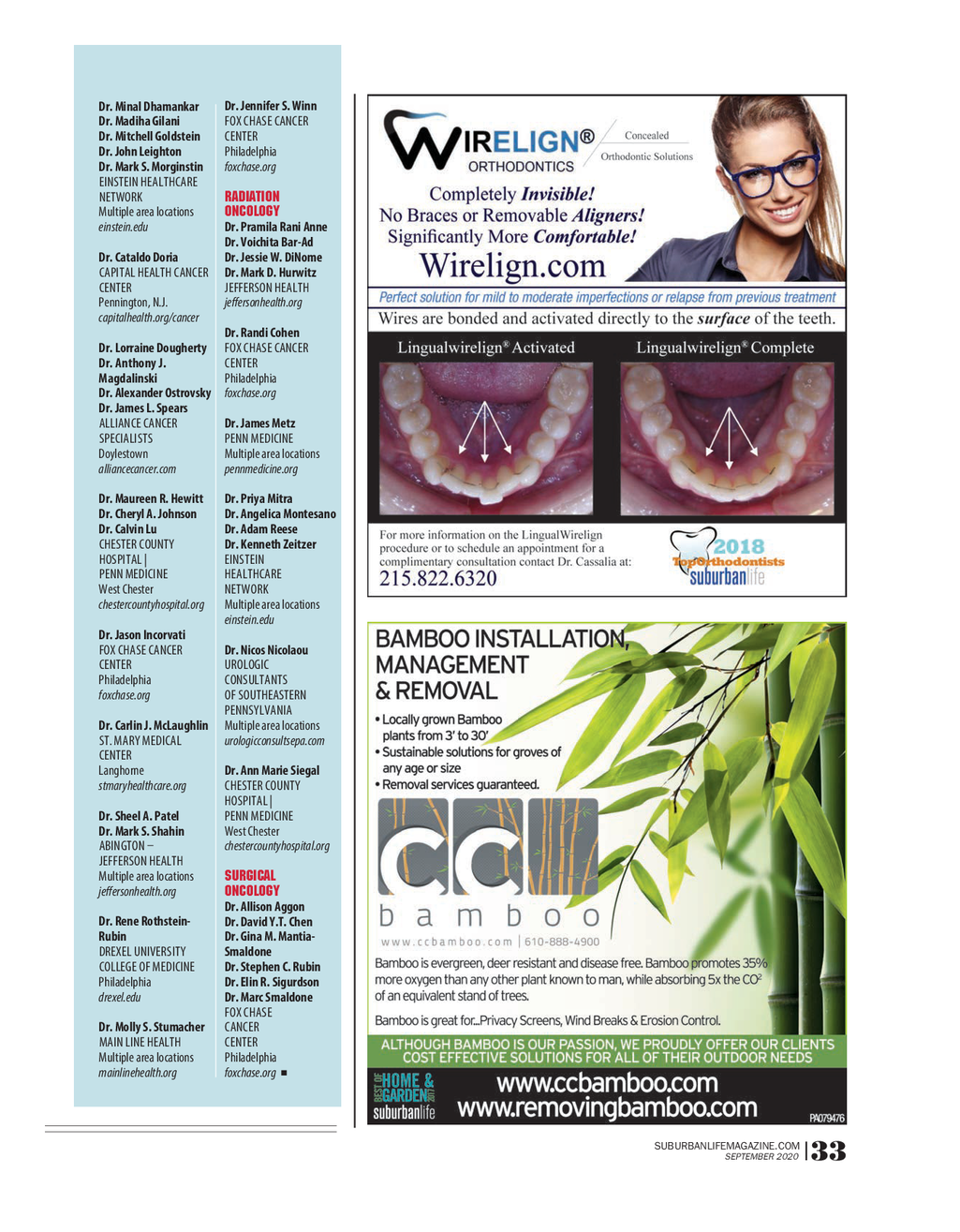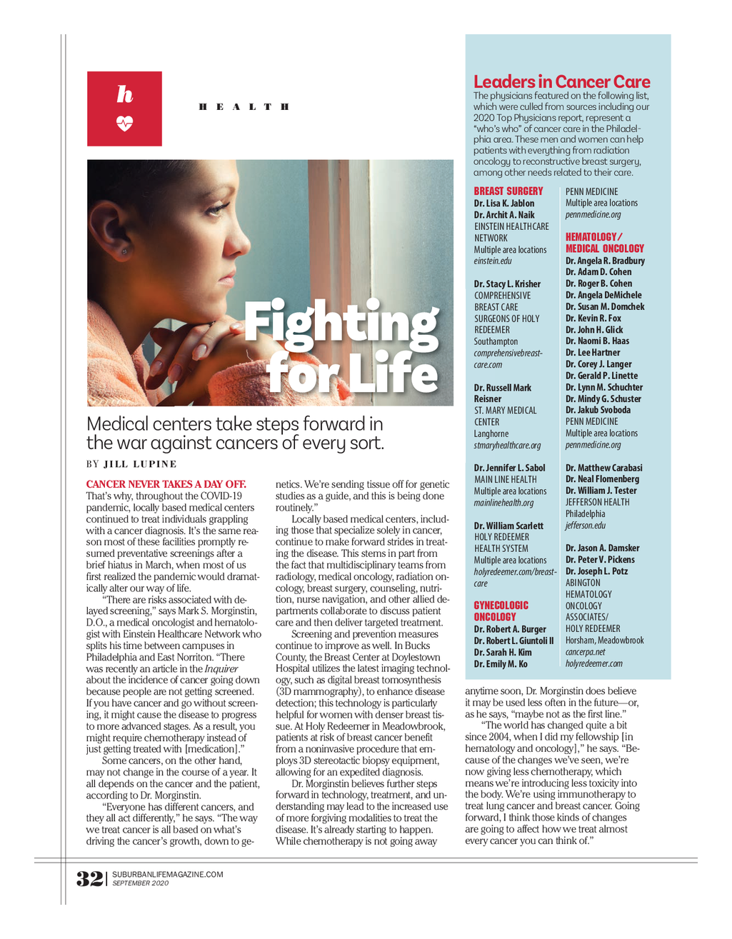SL_HealthDept_0920FIINAL.qxp_Layout 1 9 / 23 / 20 3 : 45 PM Page 1 Leaders in Cancer Care The physicians featured on the following list , which were culled from sources including our H E A L T H 2020 Top Physicians report , represent a “ who’s who ” of cancer care in the Philadel - phia area . These men and women can help patients with everything from radiation oncology to reconstructive breast surgery , among other needs related to their care . pEnn MEdicinE BREAST SURGERY Multiple area locations Dr . Lisa K . Jablon pennmedicine.org Dr . Archit A . Naik EinstEin HEaltHcarE HEMATOLOGY / nEtwork MEDICAL ONCOLOGY Multiple area locations Dr . Angela R . Bradbury einstein.edu Dr . Adam D . Cohen Dr . Roger B . Cohen Dr . Stacy L . Krisher Dr . Angela DeMichele coMprEHEnsivE Dr . Susan M . Domchek BrEast carE Dr . Kevin R . Fox surgEons of Holy Dr . John H . Glick rEdEEMEr Fighting Dr . Naomi B . Haas southampton Dr . Lee Hartner comprehensivebreast - Dr . Corey J . Langer care.com Dr . Gerald P . Linette Dr . Lynn M . Schuchter Dr . Russell Mark for Life Dr . Mindy G . Schuster Reisner Dr . Jakub Svoboda st . Mary MEdical pEnn MEdicinE cEntEr Medical centers take steps forward in Multiple area locations langhorne pennmedicine.org stmaryhealthcare.org the war against cancers of every sort . B Y JILL LUPINE Dr . Matthew Carabasi Dr . Jennifer L . Sabol Dr . Neal Flomenberg Main linE HEaltH netics . We’re sending tissue off for genetic CANCER NEVER TAKES A DAY OFF . Dr . William J . Tester Multiple area locations studies as a guide , and this is being done That’s why , throughout the COVID - 19 JEffErson HEaltH mainlinehealth.org routinely . ” pandemic , locally based medical centers philadelphia Locally based medical centers , includ - continued to treat individuals grappling jefferson.edu Dr . William Scarlett ing those that specialize solely in cancer , with a cancer diagnosis . It’s the same rea - Holy rEdEEMEr continue to make forward strides in treat - son most of these facilities promptly re - Dr . Jason A . Damsker HEaltH systEM ing the disease . This stems in part from sumed preventative screenings after a Dr . Peter V . Pickens Multiple area locations the fact that multidisciplinary teams from brief hiatus in March , when most of us Dr . Joseph L . Potz holyredeemer.com / breast - radiology , medical oncology , radiation on - first realized the pandemic would dramat - aBington care cology , breast surgery , counseling , nutri - ically alter our way of life . HEMatology tion , nurse navigation , and other allied de - “ There are risks associated with de - oncology GYNECOLOGIC partments collaborate to discuss patient layed screening , ” says Mark S . Morginstin , associatEs / ONCOLOGY care and then deliver targeted treatment . D.O . , a medical oncologist and hematolo - Holy rEdEEMEr Dr . Robert A . Burger Screening and prevention measures gist with Einstein Healthcare Network who Horsham , Meadowbrook Dr . Robert L . Giuntoli II continue to improve as well . In Bucks splits his time between campuses in cancerpa.net Dr . Sarah H . Kim County , the Breast Center at Doylestown Philadelphia and East Norriton . “ There holyredeemer.com Dr . Emily M . Ko Hospital utilizes the latest imaging technol - was recently an article in the Inquirer ogy , such as digital breast tomosynthesis about the incidence of cancer going down anytime soon , Dr . Morginstin does believe ( 3D mammography ) , to enhance disease because people are not getting screened . it may be used less often in the future — or , detection ; this technology is particularly If you have cancer and go without screen - as he says , “ maybe not as the first line . ” helpful for women with denser breast tis - ing , it might cause the disease to progress “ The world has changed quite a bit sue . At Holy Redeemer in Meadowbrook , to more advanced stages . As a result , you since 2004 , when I did my fellowship [ in patients at risk of breast cancer benefit might require chemotherapy instead of hematology and oncology ] , ” he says . “ Be - from a noninvasive procedure that em - just getting treated with [ medication ] . ” cause of the changes we’ve seen , we’re ploys 3D stereotactic biopsy equipment , Some cancers , on the other hand , now giving less chemotherapy , which allowing for an expedited diagnosis . may not change in the course of a year . It means we’re introducing less toxicity into Dr . Morginstin believes further steps all depends on the cancer and the patient , the body . We’re using immunotherapy to forward in technology , treatment , and un - according to Dr . Morginstin . treat lung cancer and breast cancer . Going derstanding may lead to the increased use “ Everyone has different cancers , and forward , I think those kinds of changes of more forgiving modalities to treat the they all act differently , ” he says . “ The way are going to affect how we treat almost disease . It’s already starting to happen . we treat cancer is all based on what’s every cancer you can think of . ” While chemotherapy is not going away driving the cancer’s growth , down to ge - SUBURBANLIFEMAGAZINE.COM SEPTEMBER 2020 32 |