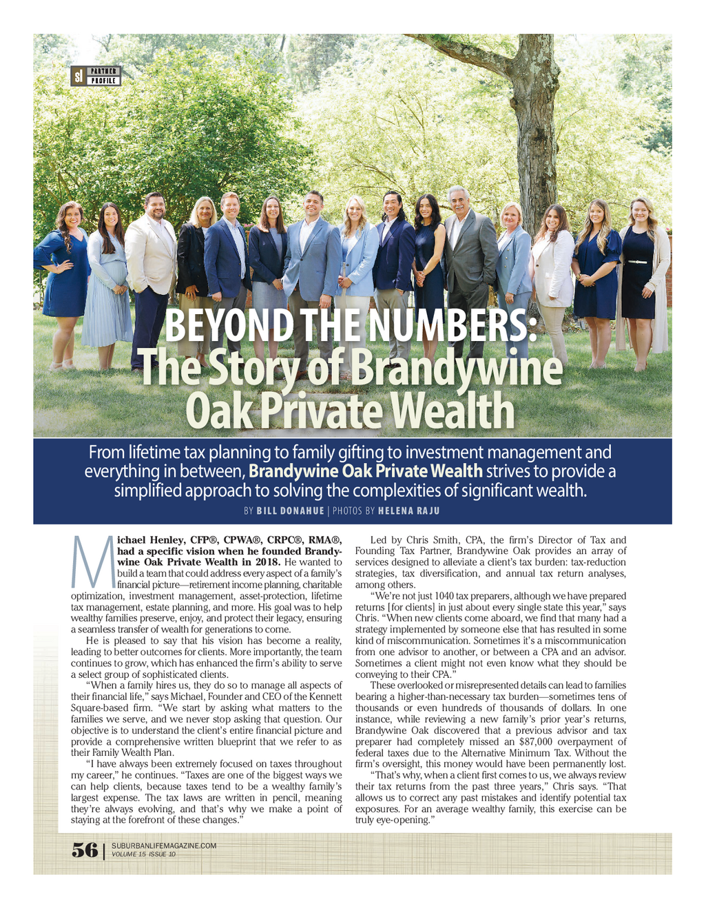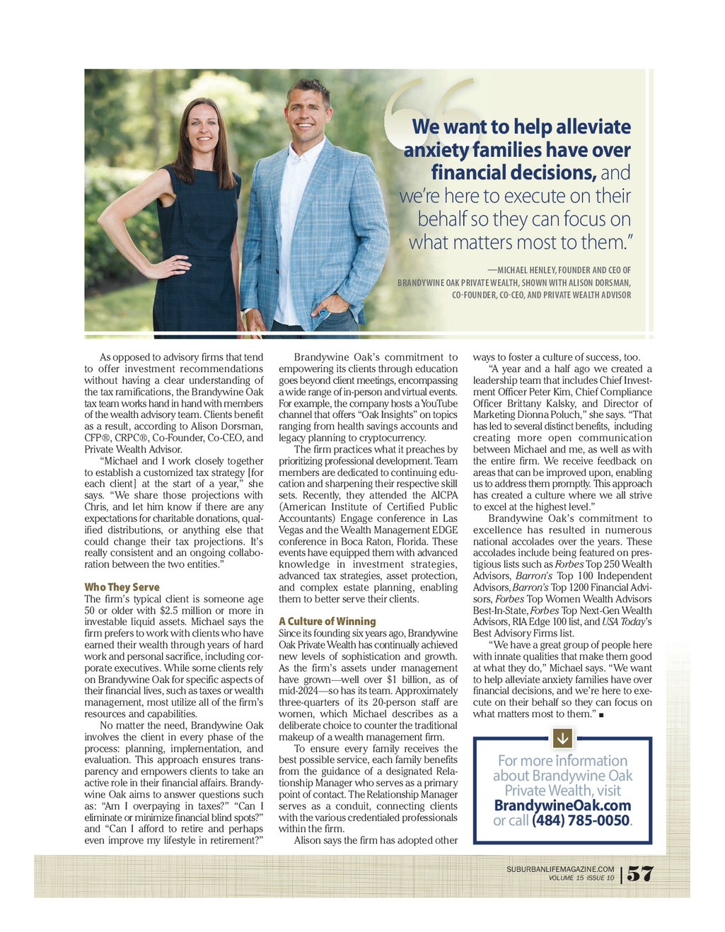 SL_PROFILE_Brandywine Oak_0624_Layout 1 7 / 2 / 24 2 : 42 PM Page 2 We want to help alleviate anxiety families have over financial decisions , and we’re here to execute on their behalf so they can focus on what matters most to them . ” — Michael henley , Founder and ceo oF Brandywine oak Private wealth , shown with alison dorsMan , co - Founder , co - ceo , and Private wealth advisor As opposed to advisory firms that tend Brandywine Oak’s commitment to ways to foster a culture of success , too . to offer investment recommendations empowering its clients through education “ A year and a half ago we created a without having a clear understanding of goesbeyond client meetings , encompassing leadershipteam that includes Chief Invest - the tax ramifications , the Brandywine Oak awide range of in - person and virtual events . ment Officer Peter Kim , Chief Compliance tax team works hand in hand with members Forexample , the company hosts a YouTube Officer Brittany Kalsky , and Director of of the wealth advisory team . Clients benefit channel that offers “ Oak Insights ” on topics MarketingDionna Poluch , ” she says . “ That as a result , according to Alison Dorsman , ranging from health savings accounts and hasled to several distinct benefits , including CFP ® , CRPC ® , Co - Founder , Co - CEO , and legacy planning to cryptocurrency . creating more open communication Private Wealth Advisor . The firm practices what it preaches by between Michael and me , as well as with “ Michael and I work closely together prioritizingprofessional development . Team the entire firm . We receive feedback on to establish a customized tax strategy [ for members are dedicated to continuing edu - areas that can be improved upon , enabling each client ] at the start of a year , ” she cationand sharpening their respective skill us to address them promptly . This approach says . “ We share those projections with sets . Recently , they attended the AICPA has created a culture where we all strive Chris , and let him know if there are any ( American Institute of Certified Public to excel at the highest level . ” expectations for charitable donations , qual - Accountants ) Engage conference in Las Brandywine Oak’s commitment to ified distributions , or anything else that Vegas and the Wealth Management EDGE excellence has resulted in numerous could change their tax projections . It’s conference in Boca Raton , Florida . These national accolades over the years . These really consistent and an ongoing collabo - eventshave equipped them with advanced accolades include being featured on pres - ration between the two entities . ” knowledge in investment strategies , tigious lists such as Forbes Top 250 Wealth advanced tax strategies , asset protection , Advisors , Barron’s Top 100 Independent Who They Serve and complex estate planning , enabling Advisors , Barron’s Top 1200 Financial Advi - The firm’s typical client is someone age them to better serve their clients . sors , Forbes TopWomen Wealth Advisors 50 or older with $ 2.5 million or more in Best - In - State , Forbes Top Next - Gen Wealth investable liquid assets . Michael says the A Culture of Winning Advisors , RIA Edge 100 list , and USA Today’s firm prefers to work with clients who have Since its founding six years ago , Brandywine Best Advisory Firms list . earned their wealth through years of hard OakPrivate Wealth has continually achieved “ Wehave a great group of people here work and personal sacrifice , including cor - new levels of sophistication and growth . with innate qualities that make them good porate executives . While some clients rely As the firm’s assets under management at what they do , ” Michael says . “ We want on Brandywine Oak for specific aspects of have grown — well over $ 1 billion , as of to help alleviate anxiety families have over their financial lives , such as taxes or wealth mid - 2024 — sohas its team . Approximately financial decisions , and we’re here to exe - management , most utilize all of the firm’s three - quarters of its 20 - person staff are cute on their behalf so they can focus on resources and capabilities . women , which Michael describes as a what matters most to them . ” ? No matter the need , Brandywine Oak deliberate choice to counter the traditional ? involves the client in every phase of the makeup of a wealth management firm . process : planning , implementation , and To ensure every family receives the evaluation . This approach ensures trans - best possible service , each family benefits For more information parency and empowers clients to take an from the guidance of a designated Rela - about Brandywine Oak active role in their financial affairs . Brandy - tionshipManager who serves as a primary Private Wealth , visit wine Oak aims to answer questions such point of contact . The Relationship Manager as : “ Am I overpaying in taxes ? ” “ Can I serves as a conduit , connecting clients BrandywineOak.com eliminateor minimize financial blind spots ? ” with the various credentialed professionals or call ( 484 ) 785 - 0050 . and “ Can I afford to retire and perhaps within the firm . even improve my lifestyle in retirement ? ” Alison says the firm has adopted other SUBURBANLIFEMAGAZINE.COM VOLUME 15 ISSUE 10 | 57