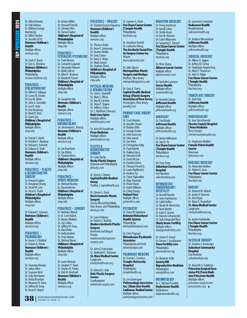 SL_Top Physicians_0824_V3 - FINAL.qxp_Layout 1 8 / 30 / 24 3 : 00 PM Page 4 4 Dr.Alfred Atanda Dr . Kristen Miller Dr . Sameer A . Patel Dr.Lawrence Leventhal PEDIATRICS – UROLOGY RADIATION ONCOLOGY 2 Dr.KirkDabney Dr . Howard Panitch Fox Chase Cancer Center RedeemerHealth Dr.Teodoro Ernesto Figueroa Dr . Penny 20Anderson Dr.William George Dr . Clement Ren | Temple Health Meadowbrook NemoursChildren’s Dr.Randi Cohen S MacKenzie Dr.DannaTauber Philadelphia redeemerhealth.org Health Dr.ShellyHayes AN Dr.MihirThacker Children’s Hospital of foxchase.org Multipleoffices Dr . Eric M . Horwitz CI Dr.JenniferM Ty Philadelphia Dr.Andrew Mermelstein nemours.org Dr.Curtis Miyamoto I NemoursChildren’s Multipleoffices Dr . Jonathan Pontell SJeffersonHealth Dr.Sangeeta K . Tyerech Y Dr.ThomasKolon Health chop.edu Dr.Catherine Weng Multipleoffices FoxChase Cancer HCenter Dr.Arun K . Srinivasan P Multipleoffices TheAesthetic Facial Plas - jeffersonhealth.org | TempleHealth Dr.Aseem Shukla P nemours.org PEDIATRICS – tic Surgery Center Inc . Philadelphia TO Dr.GregTasian PSYCHIATRY / PSYCHOLOGY Wayne SURGICAL ONCOLOGY foxchase.org Dr.DanaA . Weiss Dr.Scott H . Kozin Dr . Tami Benton facesculptormd.com Dr . Allison A . Aggon Dr.Mark Zaontz Dr.Dan A . Zlotolow Dr . Consuelo Cagande Dr . Jeffrey M . Farma Dr.Won Chang Dr.Stephen Zderic ShrinersChildren’s Dr . Alexander Moxam Dr . Julia Spears Dr . Stephanie Angela King AllianceCancer Center Children’sHospital of Philadelphia Dr.Molly Seltzer Metropolitan Plastic Dr . Mary T . Pronovost Multipleoffices Philadelphia Philadelphia Dr.EllenH . Sholevar Surgery and Medspa Dr . John A . Ridge alliancecancer.com Multipleoffices shrinerschildrens.org Dr.ElizabethTurner Marlton , New Jersey Fox Chase Cancer Center chop.edu Children’sHospital of metropolitanplastics.com | Temple Health Dr.Rachelle Lanciano PEDIATRICS – Philadelphia Philadelphia CrozerHealth PHYSICAL MEDICINE OTOLARYNGOLOGY Multipleoffices Dr . Gary A . Tuma foxchase.org Multipleoffices & REHABILITATION Dr.Nithin D . Adappa chop.edu Capital Health Medical crozerhealth.org Dr.Scott J . Davidoff Dr.Conor M . Devine Group | Plastic Surgery TRANSPLANT SURGERY Dr.Marc S . Effron Dr.Lisa M . Elden Dr . Josephine Elia Associates of New Jersey Dr . Radi Zaki Dr.Kenneth Zeitzer Dr.Roy M . Lerman Dr.John A . Germiller Nemours Children’s Pennington , New Jersey Jefferson Health JeffersonHealth Dr.Denis P . Rogers Dr.Luv R . Javia Health psaofnj.com Multiple offices Multipleoffices Dr.Jeffery J . Rowe Dr.Ken Kazahaya Multiple offices jeffersonhealth.org jeffersonhealth.org Dr . L . Matthew Schwartz Dr.Mark D . Rizzi nemours.org PRIMARY CARE / URGENT MainLine Spine Dr.Karen Zur CARE UROGYNECOLOGY RADIOLOGY Multipleoffices Children’sHospitalof PEDIATRICS – Dr . Scott Drobnis Dr . Jose Sixto Maceda Dr.Paul Brady mainlinespine.com Philadelphia RHEUMATOLOGY Dr.JenniferDwyer Chester County Hospital JeffersonHealth Multipleoffices Dr . Annemarie C . Brescia Dr . Barbara Elko | Penn Medicine Multipleoffices Dr.John M . Vasudevan chop.edu NemoursChildren’s Dr . George Geisler West Chester jeffersonhealth.org PennMedicine Health Dr.JohnGoreczny chestercountyhospital.org Multipleoffices Dr.Patrick C . Barth Multiple offices Dr . John Junod Dr.Barton Milestone pennmedicine.org Dr.Heather C . Nardone nemours.org Dr . Jon Keim Dr . Stephanie Molden Dr.Jian Q . Yu Dr.Richard J . Schmidt Dr . Christopher Kirby Female Pelvic Health FoxChase Cancer Center PLASTIC & Dr . Udayan K . Shah Dr . Jon Burnham Dr . Paul Kolecki Center | Temple Health RECONSTRUCTIVE NemoursChildren’s Dr . Jay Mehta Dr . Ruijing Liang Newtown Philadelphia SURGERY Health Dr.PamelaWeiss Dr . Shannon Lieb fphcenter.com foxchase.org Dr.LouisBucky Multipleoffices Children’s Hospital of Dr . Janet McGee BuckyPlastic Surgery nemours.org Philadelphia Dr.Heather Osher UROLOGIC ONCOLOGY Dr.Penn Tong Ardmoreand Philadelphia Multipleoffices Dr . Thomas Powell Jr . Dr . Alexander Kutikov SuburbanCommunity drbucky.com PEDIATRICS – PLASTIC chop.edu Dr . Laura Rutkiewicz Dr . Robert G . Uzzo Hospital & RECONSTRUCTIVE Dr . Andrea Tse Fox Chase Cancer Center EastNorriton Dr.Ernest J . Cimino SURGERY PEDIATRICS – Dr . Taher Vajihuddin Philadelphia suburbanhosp.org CapitalHealthMedical Dr.Howard Caplan SPORTS MEDICINE Dr . Olga Vinshtok foxchase.org Group Dr.Benjamin Chang Dr . Michael Beasley Dr . Florin Vlasie REPRODUCTIVE Yardley | capitalhealth.org Dr.David W . Low Dr . Naomi Brown Dr . Keith Williams UROLOGY ENDOCRINOLOGY / Dr.Jesse A . Taylor Children’s Hospital of Dr . Ching Yeung Dr . Michael W . Bickell INFERTILITY Dr.Steven L . Davis Children’sHospital of Philadelphia Patient First Dr . Justin D . Harmon Dr.Russell Hayden DavisCosmetic Plastic Philadelphia Multipleoffices Multiple offices Dr . Ravi Rajan Dr.Anne Hutchinson Surgery Multipleoffices chop.edu patientfirst.com Dr.Brian D . Rosenthal Dr.Caleb Kallen CherryHill and Northfield , chop.edu St.Mary Medical Center Dr.Nicole M . Marchetto NewJersey , and Philadelphia PEDIATRICS – SURGERY PSYCHIATRY Langhorne Dr.Ryan Martin daviscps.com Dr.Edward J . Caterson Dr . Nicholas Abend Dr . Fayez El - Gabalawi stmaryhealthcare.org Dr.Isaac E . Sasson NemoursChildren’s Dr . N . Scott Adzick Belmont Behavioral Dr.Brianna Schumacher Dr.Lana Feldman Health Dr.Myron Allukian Health System Dr . Justin Friedlander Dr.Sally Fitzgerald Vitez Dr.Robert J . Skalicky Multipleoffices Dr . Joy Collins Philadelphia Fox Chase Cancer Center ShadyGrove Fertility ModernAesthetic Plastic nemours.org Dr.Jeffrey M . Ewig belmontbehavioral.com | Temple Health Multipleoffices Surgery Dr.AlanFlake Philadelphia shadygrovefertility.com NewtownandKing of PEDIATRICS – Dr . Holly Hedrick Dr . Chris Pagnani foxchase.org Prussia PULMONOLOGY Dr.Peter Mattei Rittenhouse Psychiatric Dr.Clarisa R . Gracia modernaestheticplastic - Dr.Aaron S . Chidekel Dr . Michael Nance Associates VASCULAR SURGERY Dr.Steven J . Son