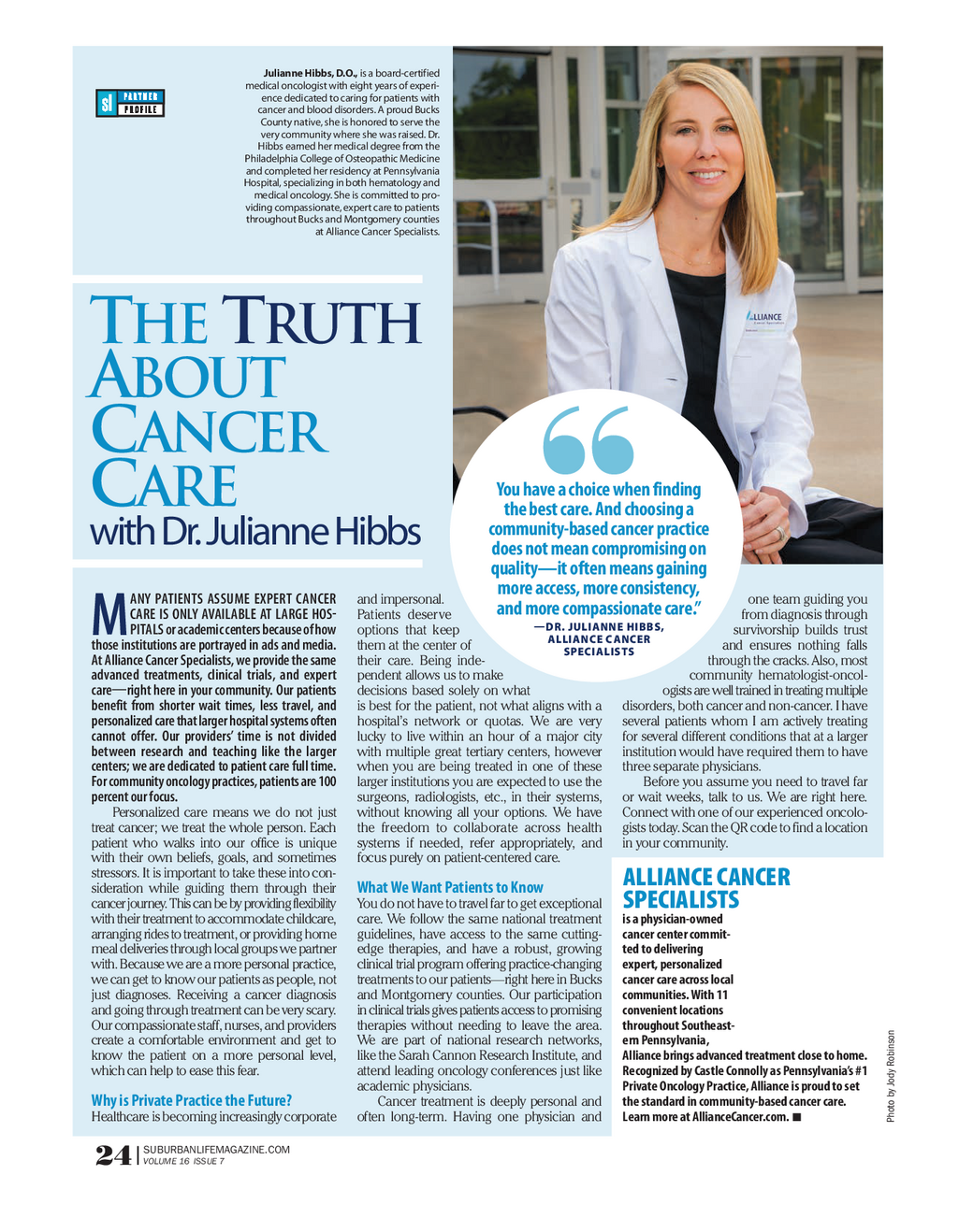 0525_AllianceCancer_profile - v2_Layout 1 6 / 12 / 25 9 : 48 AM Page 1 Julianne Hibbs , D.O . , is a board - certified medical oncologist with eight years of experi - ence dedicated to caring for patients with cancer and blood disorders . A proud Bucks County native , she is honored to serve the very community where she was raised . Dr . Hibbs earned her medical degree from the Philadelphia College of Osteopathic Medicine and completed her residency at Pennsylvania Hospital , specializing in both hematology and medical oncology . She is committed to pro - viding compassionate , expert care to patients throughout Bucks and Montgomery counties at Alliance Cancer Specialists . THETRUTH ABOUT CANCER You have a choice when finding CARE the best care . And choosing a community - based cancer practice with Dr . Julianne Hibbs does not mean compromising on quality — it often means gaining more access , more consistency , ANY PATIENTS ASSUME EXPERT CANCER and impersonal . one team guiding you and more compassionate care . ” CARE IS ONLY AVAILABLE AT LARGE HOS ? Patients deserve from diagnosis through ? DR . JULIANNE HIBBS , PITALS or academic centers because of how options that keep survivorship builds trust M ALLIANCE CANCER those institutions are portrayed in ads and media . them at the center of and ensures nothing falls SPECIALISTS At Alliance Cancer Specialists , we provide the same their care . Being inde - through the cracks . Also , most advanced treatments , clinical trials , and expert pendent allows us to make community hematologist - oncol - care ? right here in your community . Our patients decisions based solely on what ogists are well trained in treating multiple benefit from shorter wait times , less travel , and is best for the patient , not what aligns with a disorders , both cancer and non - cancer . I have personalized care that larger hospital systems often hospital’s network or quotas . We are very several patients whom I am actively treating cannot offer . Our providers ’ time is not divided lucky to live within an hour of a major city for several different conditions that at a larger between research and teaching like the larger with multiple great tertiary centers , however institution would have required them to have centers ; we are dedicated to patient care full time . when you are being treated in one of these three separate physicians . For community oncology practices , patients are 100 larger institutions you are expected to use the Before you assume you need to travel far percent our focus . surgeons , radiologists , etc . , in their systems , or wait weeks , talk to us . We are right here . Personalized care means we do not just without knowing all your options . We have Connect with one of our experienced oncolo - treat cancer ; we treat the whole person . Each the freedom to collaborate across health gists today . Scan the QR code to find a location patient who walks into our office is unique systems if needed , refer appropriately , and in your community . with their own beliefs , goals , and sometimes focus purely on patient - centered care . stressors . It is important to take these into con - ALLIANCE CANCER sideration while guiding them through their What We Want Patients to Know cancer journey . This can be by providing flexibility You do not have to travel far to get exceptional SPECIALISTS with their treatment to accommodate childcare , care . We follow the same national treatment is a physician - owned arranging rides to treatment , or providing home guidelines , have access to the same cutting - cancer center commit - meal deliveries through local groups we partner edge therapies , and have a robust , growing ted to delivering with . Because we are a more personal practice , clinical trial program offering practice - changing expert , personalized we can get to know our patients as people , not treatments to our patients — right here in Bucks cancer care across local just diagnoses . Receiving a cancer diagnosis and Montgomery counties . Our participation communities . With 11 and going through treatment can be very scary . in clinical trials gives patients access to promising convenient locations Our compassionate staff , nurses , and providers therapies without needing to leave the area . throughout Southeast - son create a comfortable environment and get to We are part of national research networks , ern Pennsylvania , bin know the patient on a more personal level , like the Sarah Cannon Research Institute , and Alliance brings advanced treatment close to home . Ro y which can help to ease this fear . attend leading oncology conferences just like Recognized by Castle Connolly as Pennsylvania’s # 1 Jod academic physicians . Private Oncology Practice , Alliance is proud to set by o Why is Private Practice the Future ? Cancer treatment is deeply personal and the standard in community - based cancer care . hot Healthcare is becoming increasingly corporate often long - term . Having one physician and Learn more at AllianceCancer.com . ! P SUBURBANLIFEMAGAZINE.COM VOLUME 16 ISSUE 7 24 |